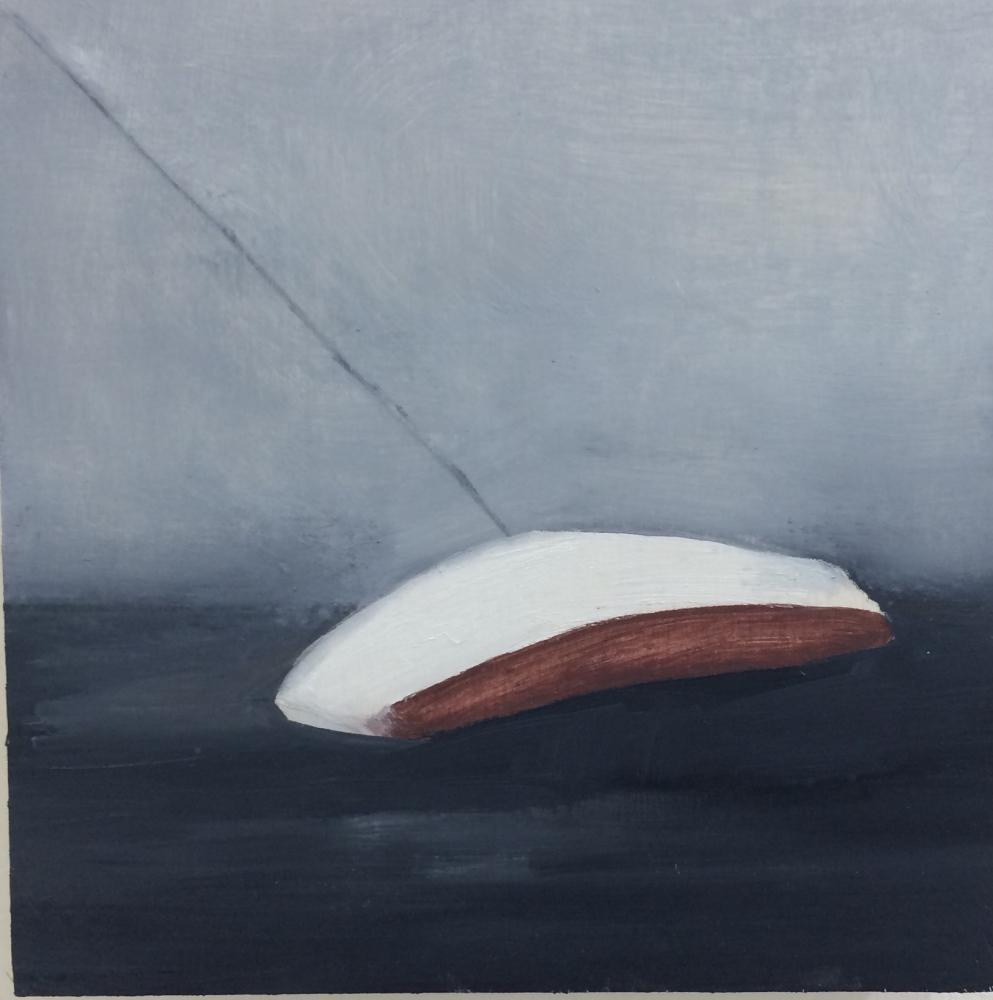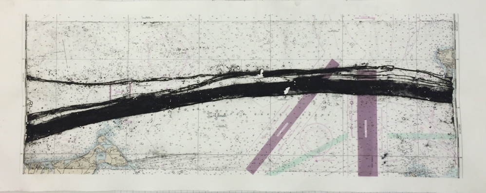 “Catastrophes” is a very strange and rewarding painting exhibition. It’s strange because it combines subtle and refined abstractions with almost cartoonish small scenes of coastal trouble. And amongst these dominant forms are ranks of outliers: an atmospherically soft landscape, a coastal landscape rendered in a traditional painterly-realism style, a suite of richly bleak coastal etchings and then finally a map of the Atlantic off Rhode Island with a grimly sweeping black stroke slashing through it.