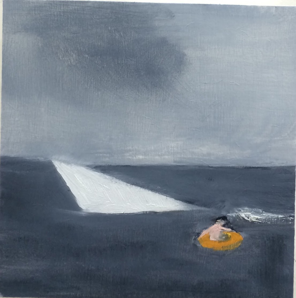 But Droge leaves us a trail we can choose to follow. If “The Year the Ocean Froze,” for example, were untitled, we might remain in the experiential mode of Droge’s atmospheric abstractions. But the title puts us within an annual rhythm that not only adds a bit of nostalgia, but makes all the water (in the entire show) colder. That made me, for example, fear then for the figure in “Life Saver” whose lobster boat is sinking; the title in this case is not necessarily some heroic agent – it could just mean the orange flotation device holding the figure in the freezing water.