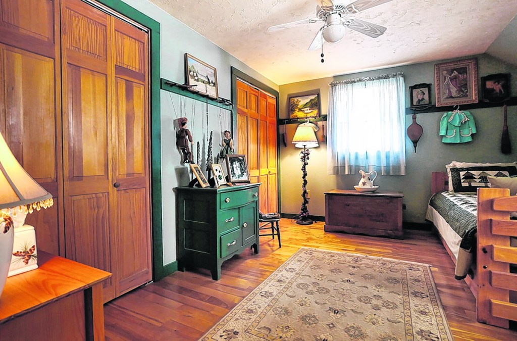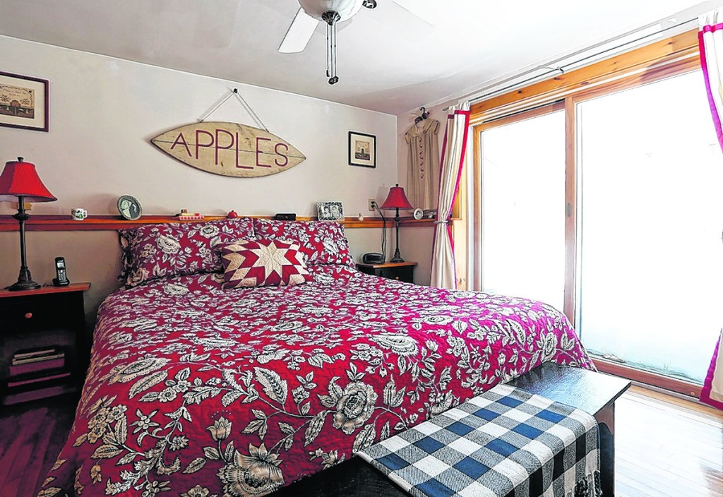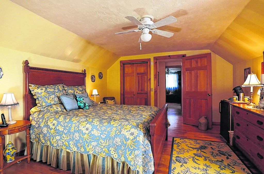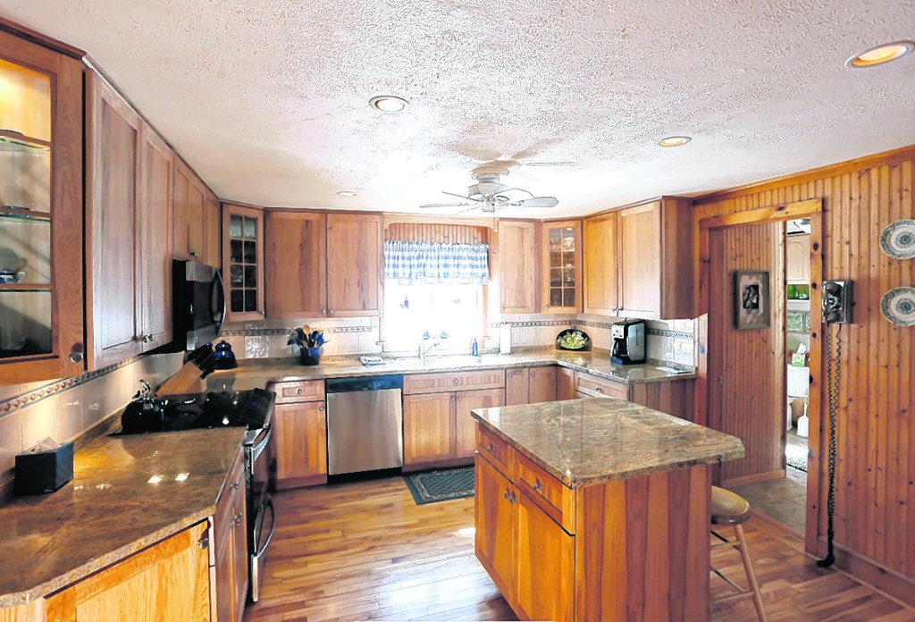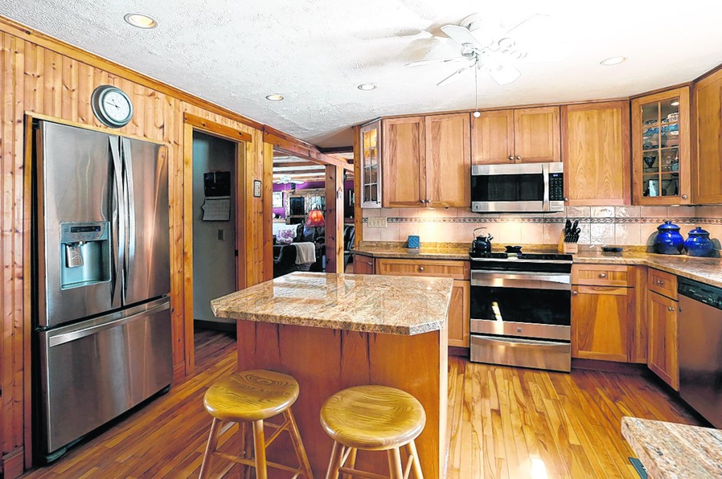 Handsome woodwork, including beadboard and exposed ceiling beams, is among the foremost features of this 1,920-square-foot home, whose first level is primarily open-concept. Dining room, with pellet stove on brick hearth, and living room flow together in a spacious L. The new kitchen is a delight. There’s a walk-in pantry with built-ins; granite-topped counters including a moveable island; cool tile backsplashes all around; and stainless-and-black appliances.