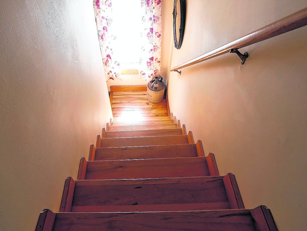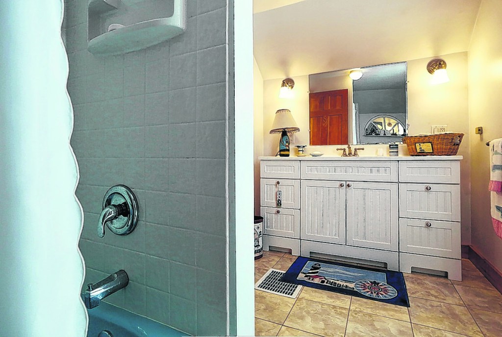 Upstairs, there’s a second master suite, on the home’s east side. The full bath with soaking tub is practically all-new, the walk-in closet is lighted, and the suite has an outside-stairwell private entrance, a boon to guests. Across the hall, the third bedroom has a pair of double closets, one of which serves nicely as an office/computer enclosure.