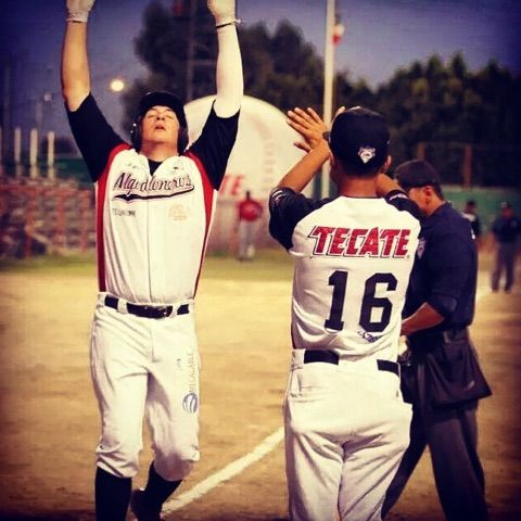 Anthony D’Alfonso (left) crosses home in a Mexican-league game.