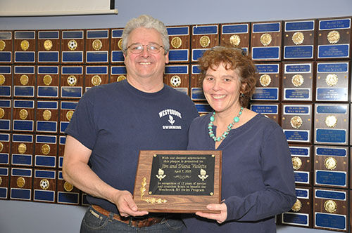 The Westbrook High School Swim Boosters, along with the Westbrook Seals Swim Club, recently honored Jim and Diana Violette for their years of dedication and service to both groups.  Jim Violette is chairman of the Westbrook School Committee. The Violette family has provided 15 years of service to the Seals team and 12 years of service to the high school Swim Boosters. Courtesy photo