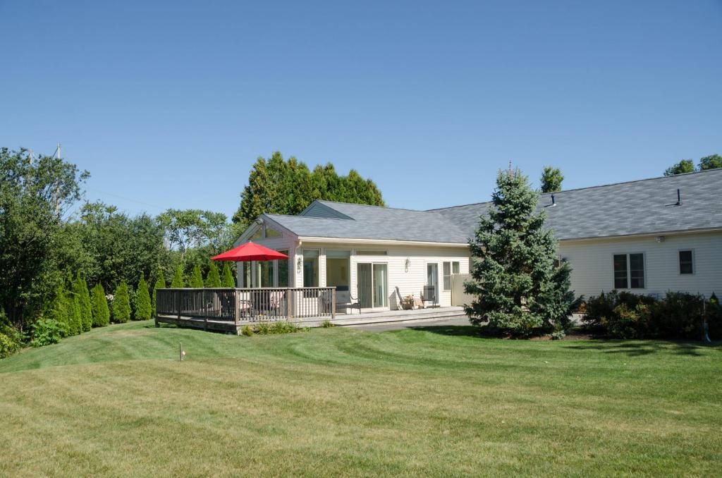Built in 2006, the property is brand-new-immaculate. The home’s main living area is open-concept, combining a huge kitchen, and a huge, maple-floored living/dining room that has an end wall entirely of built-ins. The kitchen is a delight, with white appliances and extensive cabinetry, and granite counters including a two-level breakfast bar and a work desk that perfectly fits a laptop (great for keeping an eye on recipes). Down the hall, past a laundry enclosure and side entrance to residential parking, is a wonderful sunroom, whose full-view doors access a big deck.
