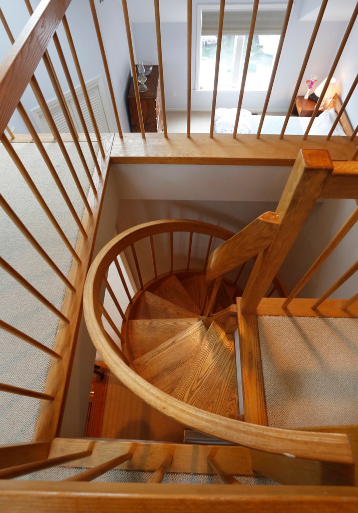 Set in the master’s cathedral ceiling is one of two new solar-powered skylights. The other such skylight illuminates the top-level loft/bedroom, which also works perfectly as a studio/large home office, and is open balcony-fashion to the master bedroom below.