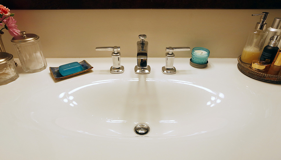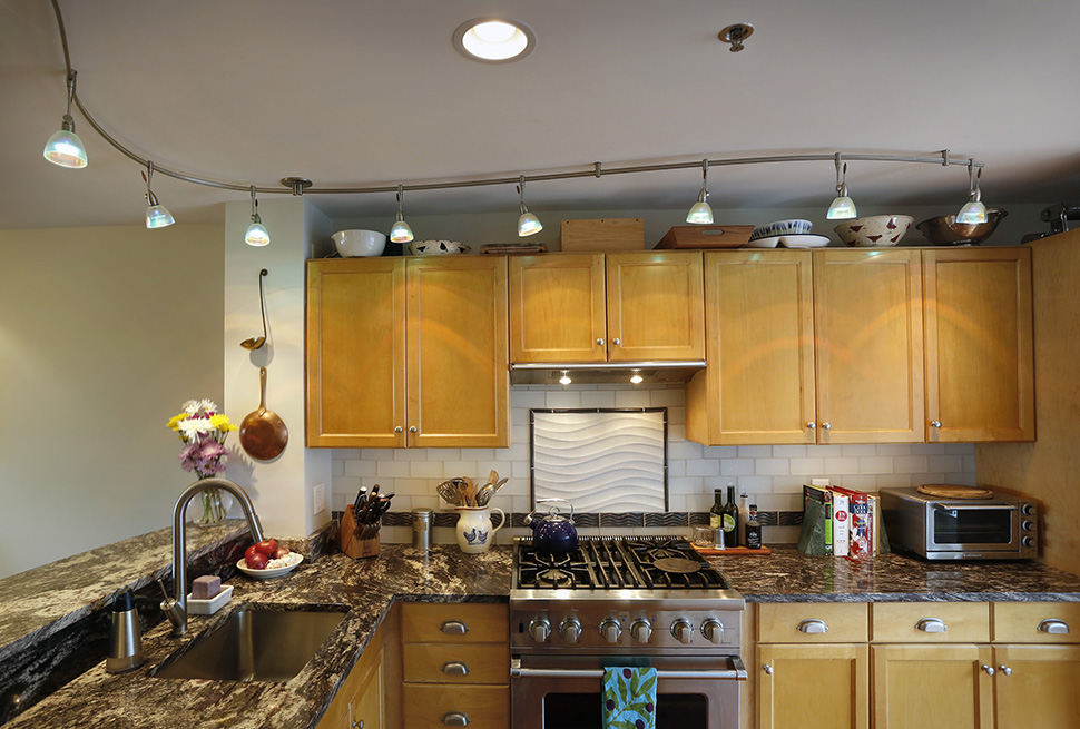 If “marine-grade” sounds like a nautical allusion, so be it. The owners, whose activities include sailing, included subtle design nods to the home’s harborfront character, in the wavy lines of the kitchen’s glass and ceramic accents to the subway tile backsplashes, and the flow of the pattern on the curved, two-level granite bar, which has a carved-in drainboard.