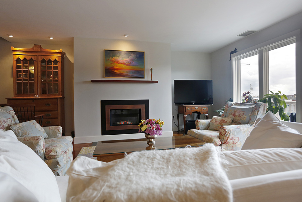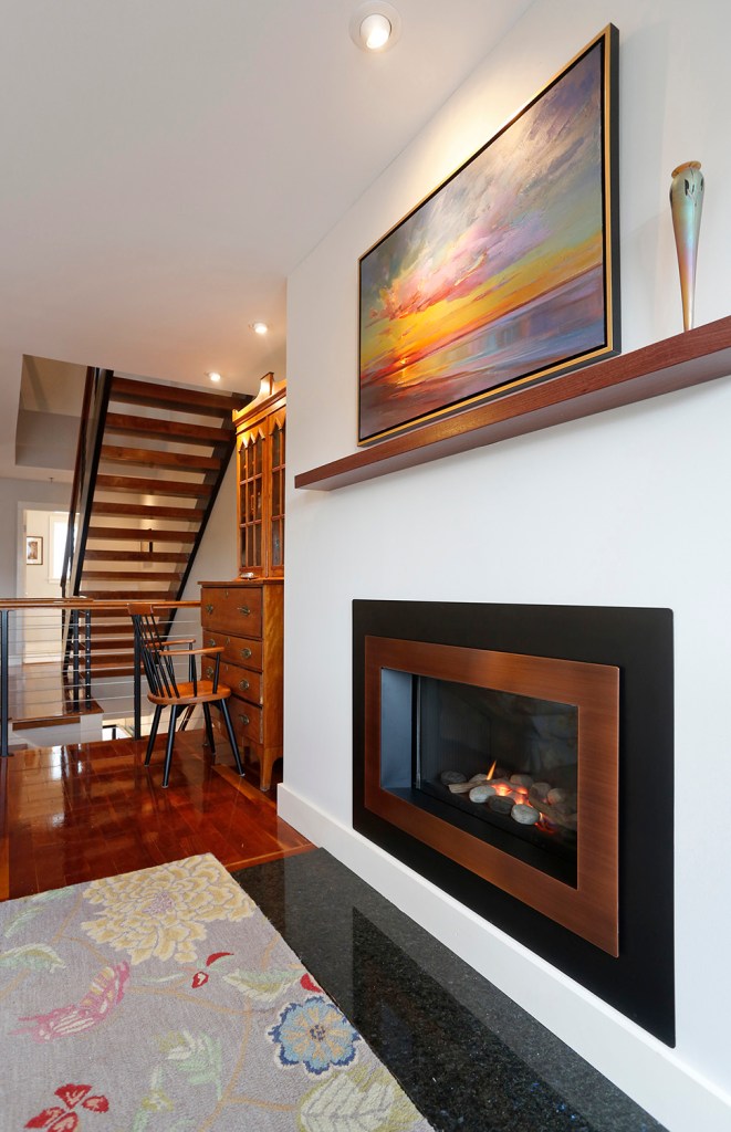 A key element of the rehab was enhancing light and freeing sight lines, as was achieved in the airy staircase, whose 4-inch cherry treads have no risers, and are complemented by cables and the minimum of balusters. The end-to-end main level is perfectly open, as the gourmet kitchen looks through the dining area and through the living room – note its new, copper-surround gas fireplace and purpleheart mantel – to a full-windowed end wall that faces west and ushers in magnificent sunsets.