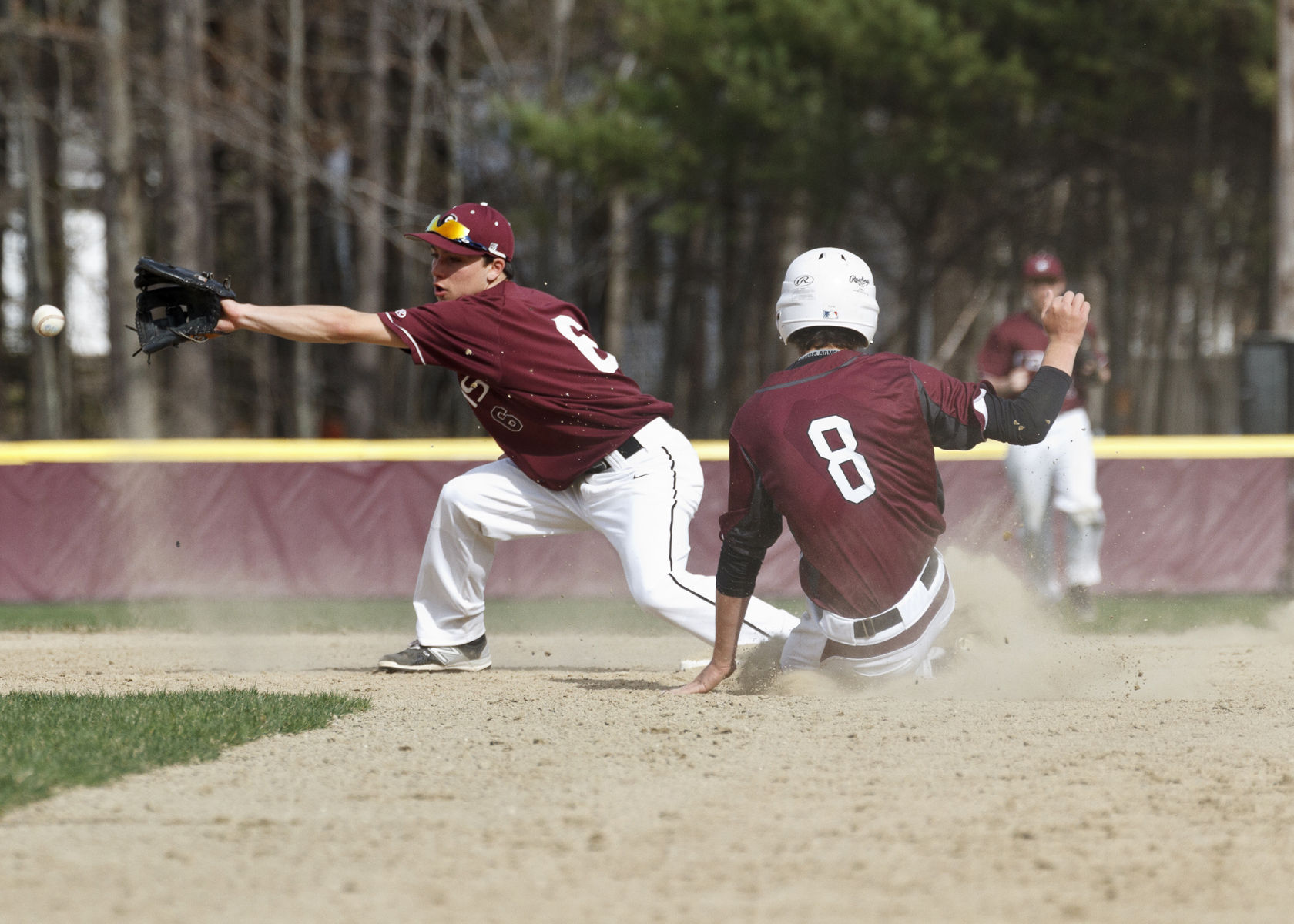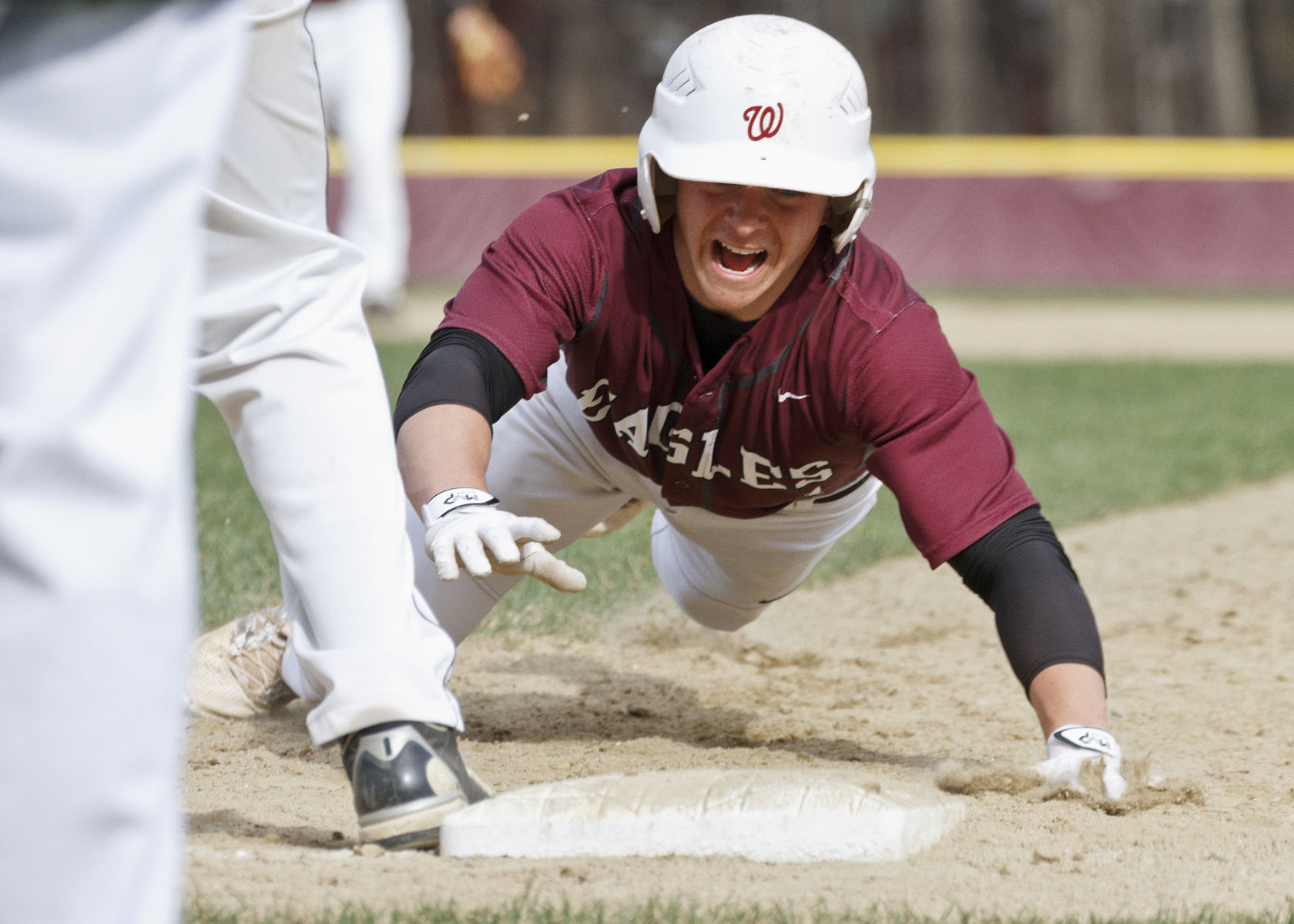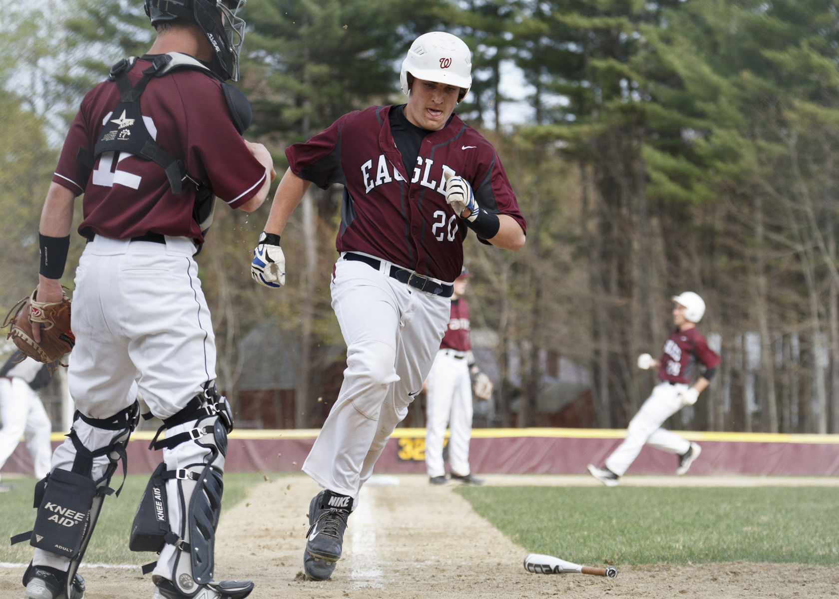 Windham’s Zach Alpern crosses home for the Eagles’ first run at Gorham on Tuesday.Gorham’s Jason Komulainen stretches out to capture the throw at second, but Windham’s Tyler Johnson beats the ball to the bag.Windham’s Josh Dugas dives back to first at Gorham on Tuesday.Windham’s Jack Butts catches Gorham’s Logan Drouin out at second on a 6-4 fielder’s choice.Windham starting pitcher Tanner Laberge takes a cut at the ball against Gorham on Tuesday.Gorham’s Derek Brown stepped in late in the game to relieve starter Sam Kilborn.