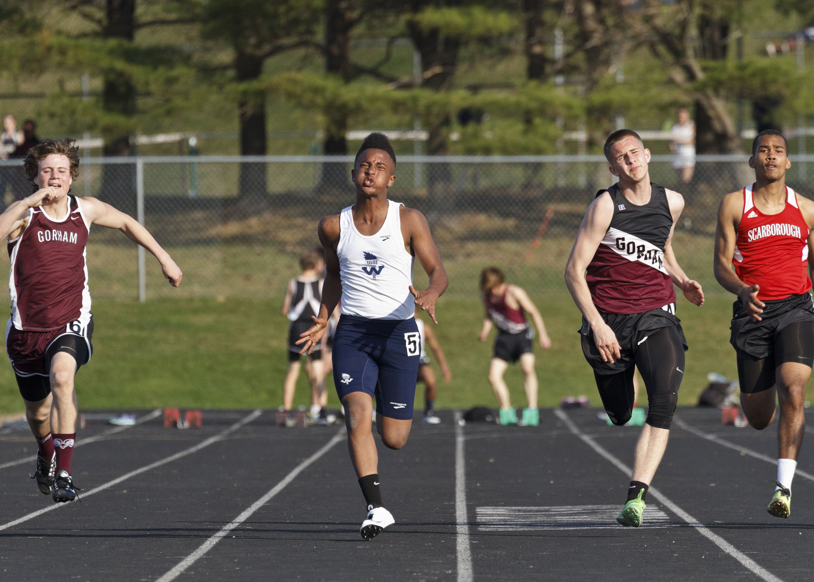 Westbrook’s James Brooking races opponents from Windham, Gorham and Scarborough in the 100-meter dash at home on Monday.