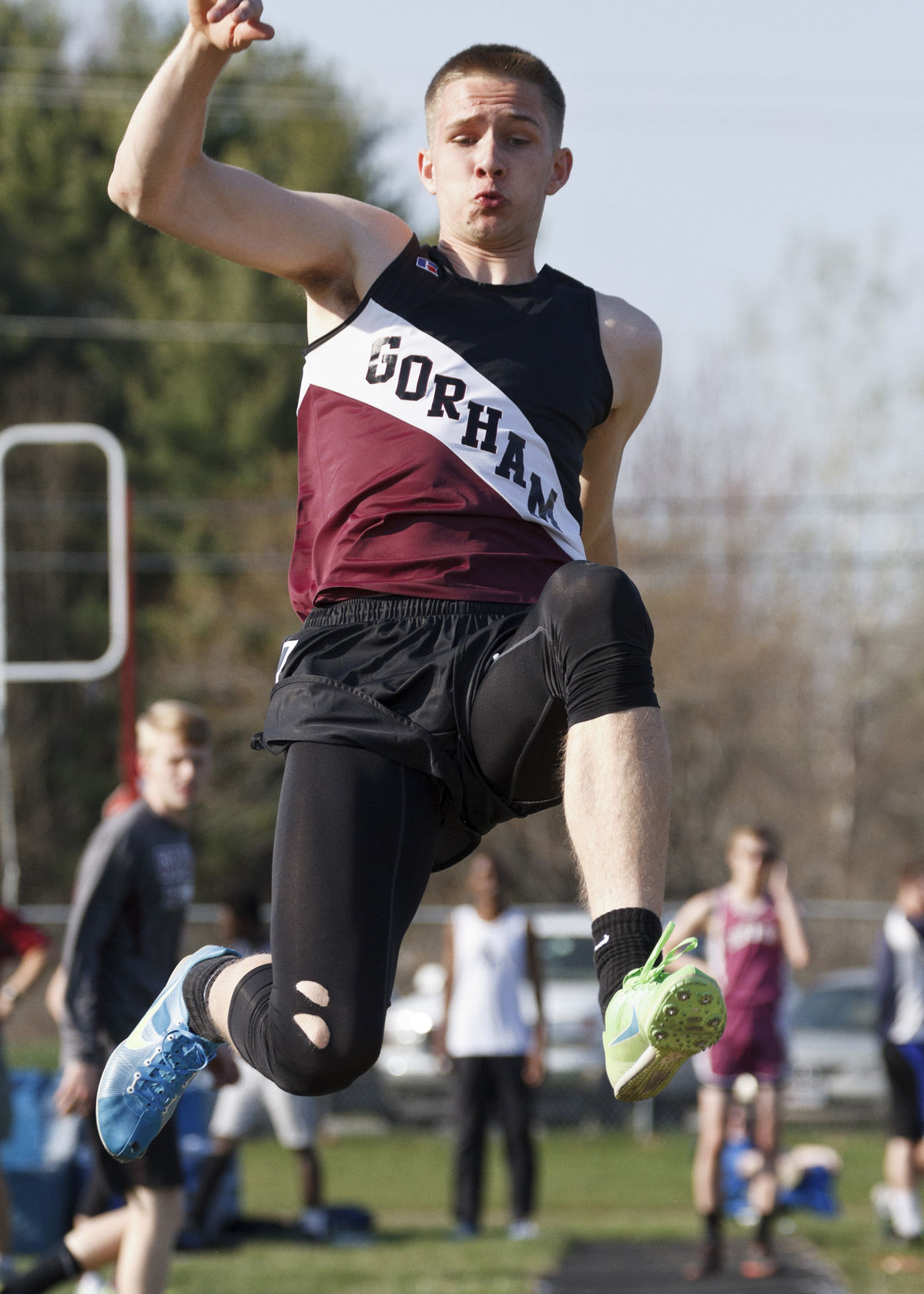 Gorham’s Billy Ruby competes in the boys long jump at Westbrook on Monday.