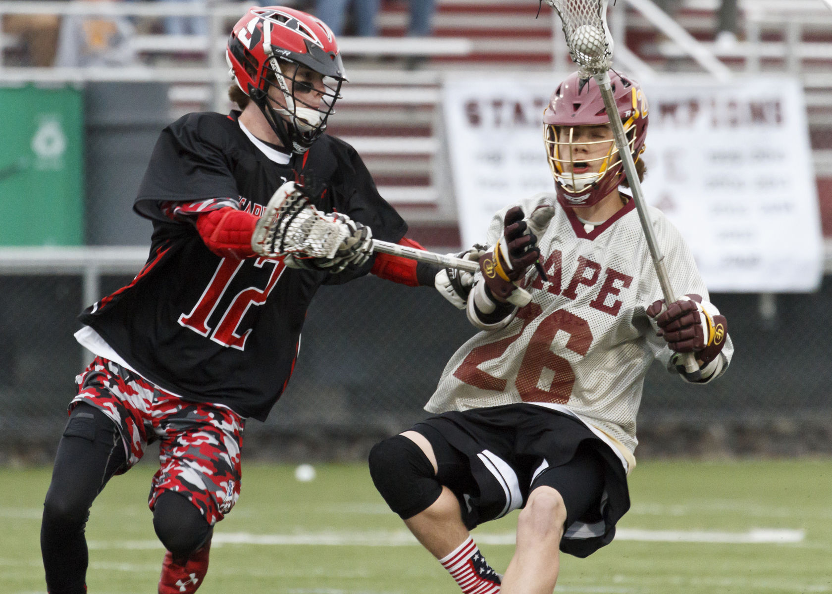 Scarborough’s Colin Hayward harasses Finn Raymond of Cape Elizabeth in the Red Storm’s 10-4 loss to the Capers Saturday evening.