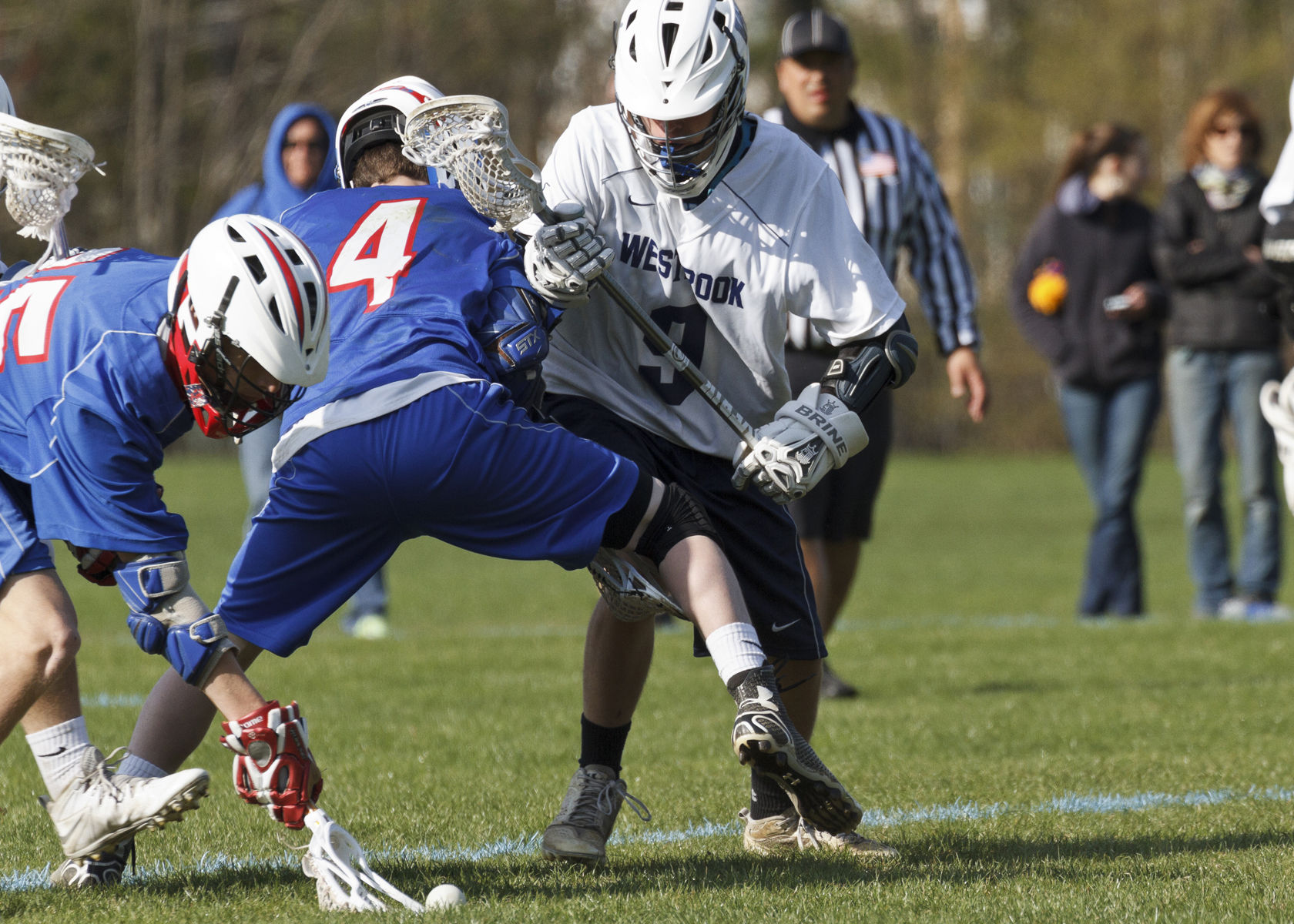 Brandon Labbe of Westbrook tangles with a pair of Eagles in pursuit of a ground ball.