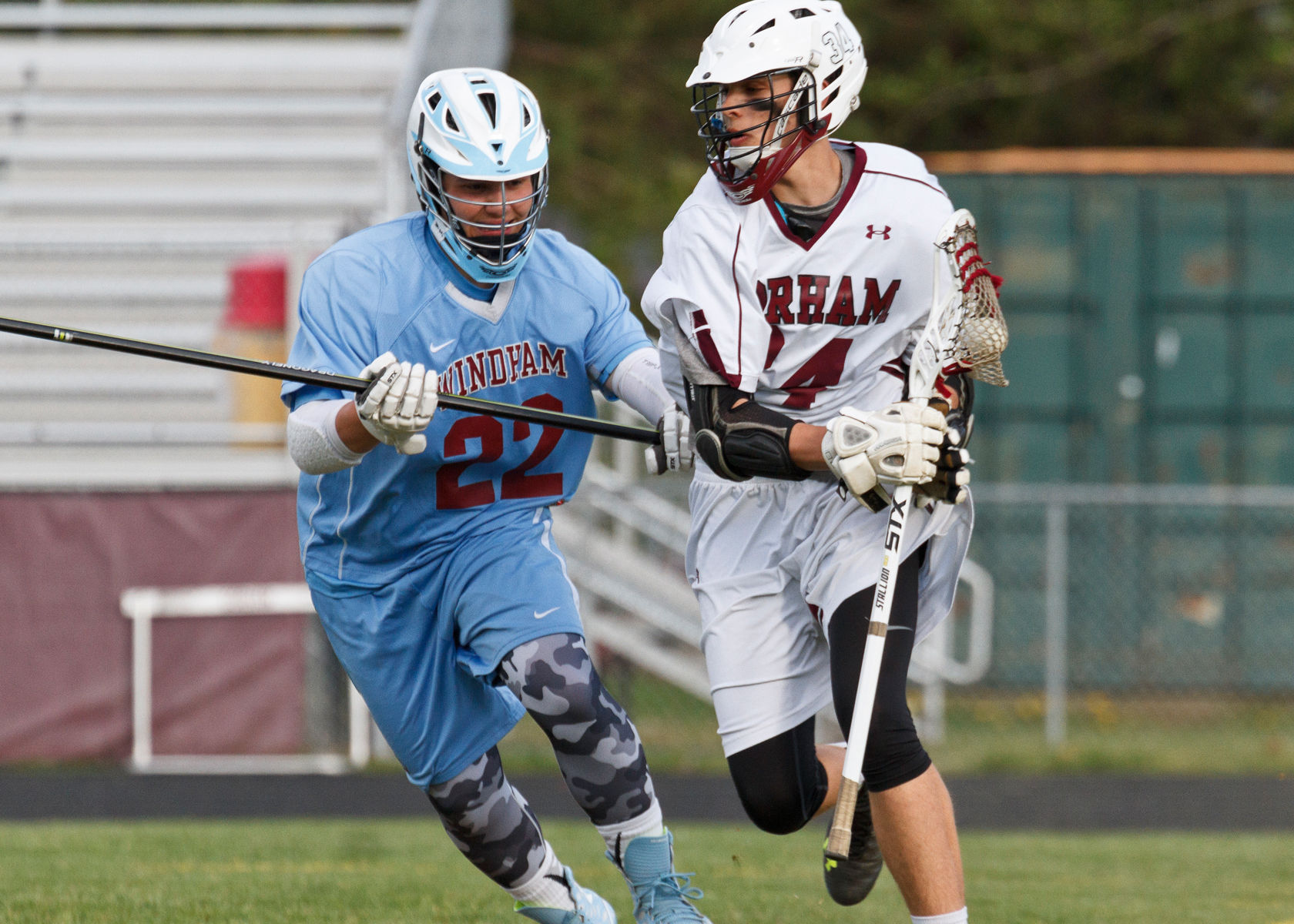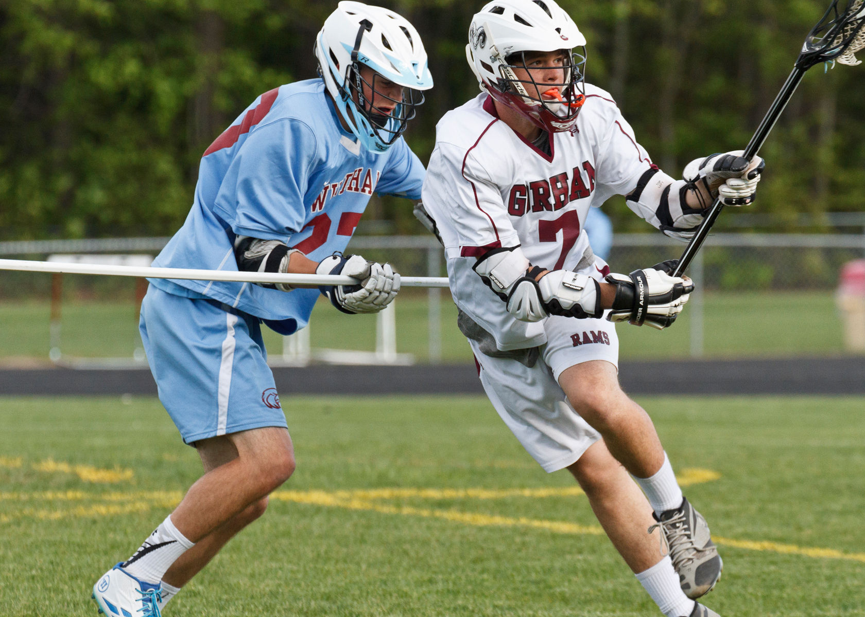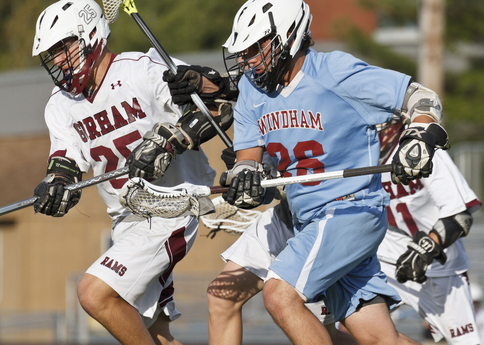 Windham’s Jake Segal defends Gorham attacker Cam Wright in the Rams’ 15-10 win over the Eagles on Friday.