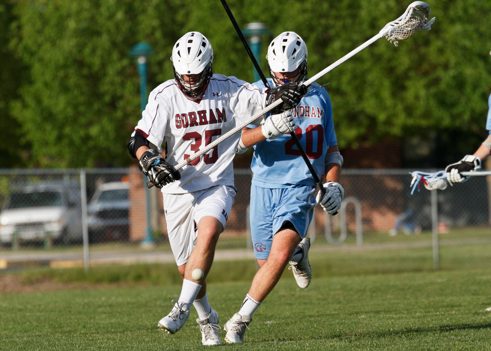 Gorham’s Matt Anderson and Windham’s Alec Emerson vie for a ground ball.