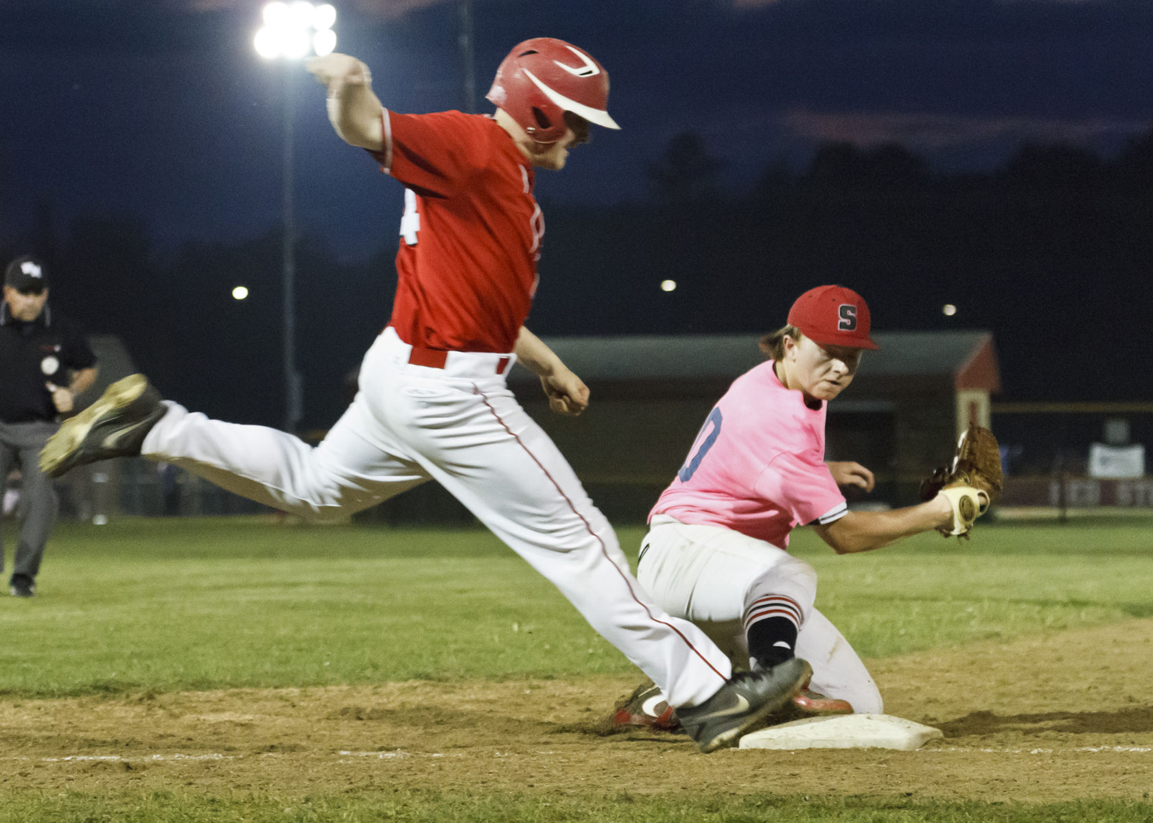 Covering first, Scarborough pitcher Sam Warren catches out South Portland batter Matt Beecher.
