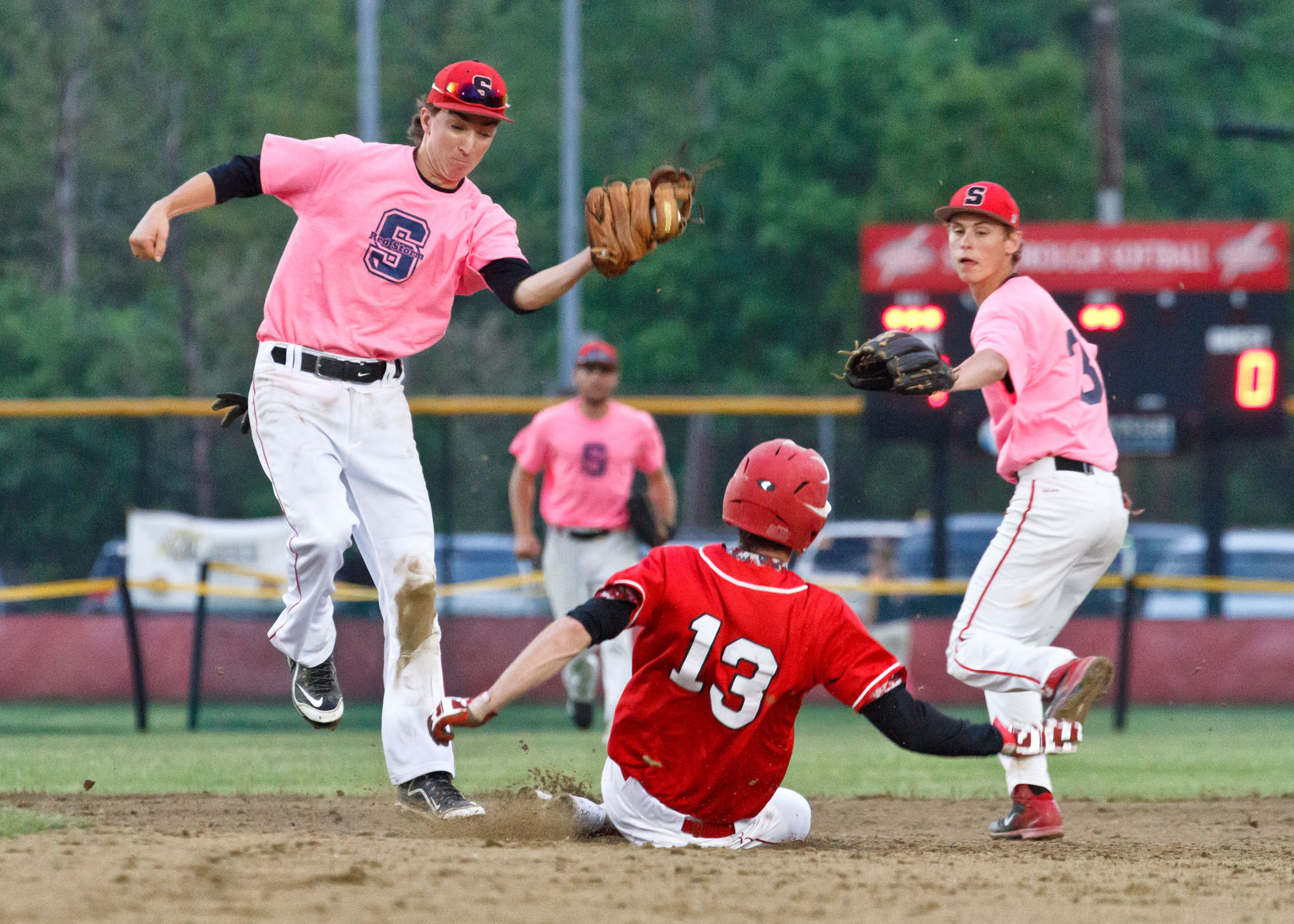 Scarborough’s Wyatt Bridgham slipped in the wet dirt attempting to steal on Thursday night – and subsequently got caught out in a pickle, tagged by the Riots’ second baseman.