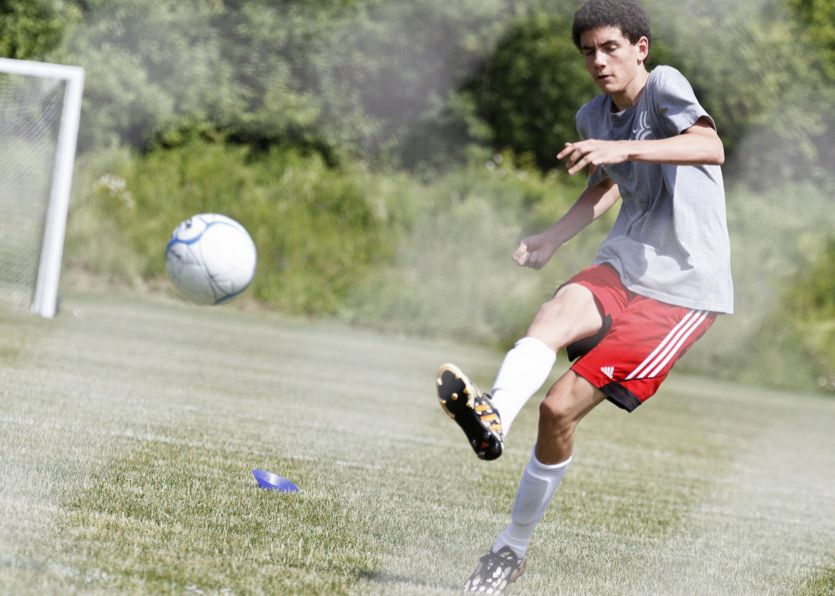 DJ Henrikson takes a shot in a so-called “crossbar challenge” at the end of practice with his Rosevelt Soccer Club U18 boys team on Friday.