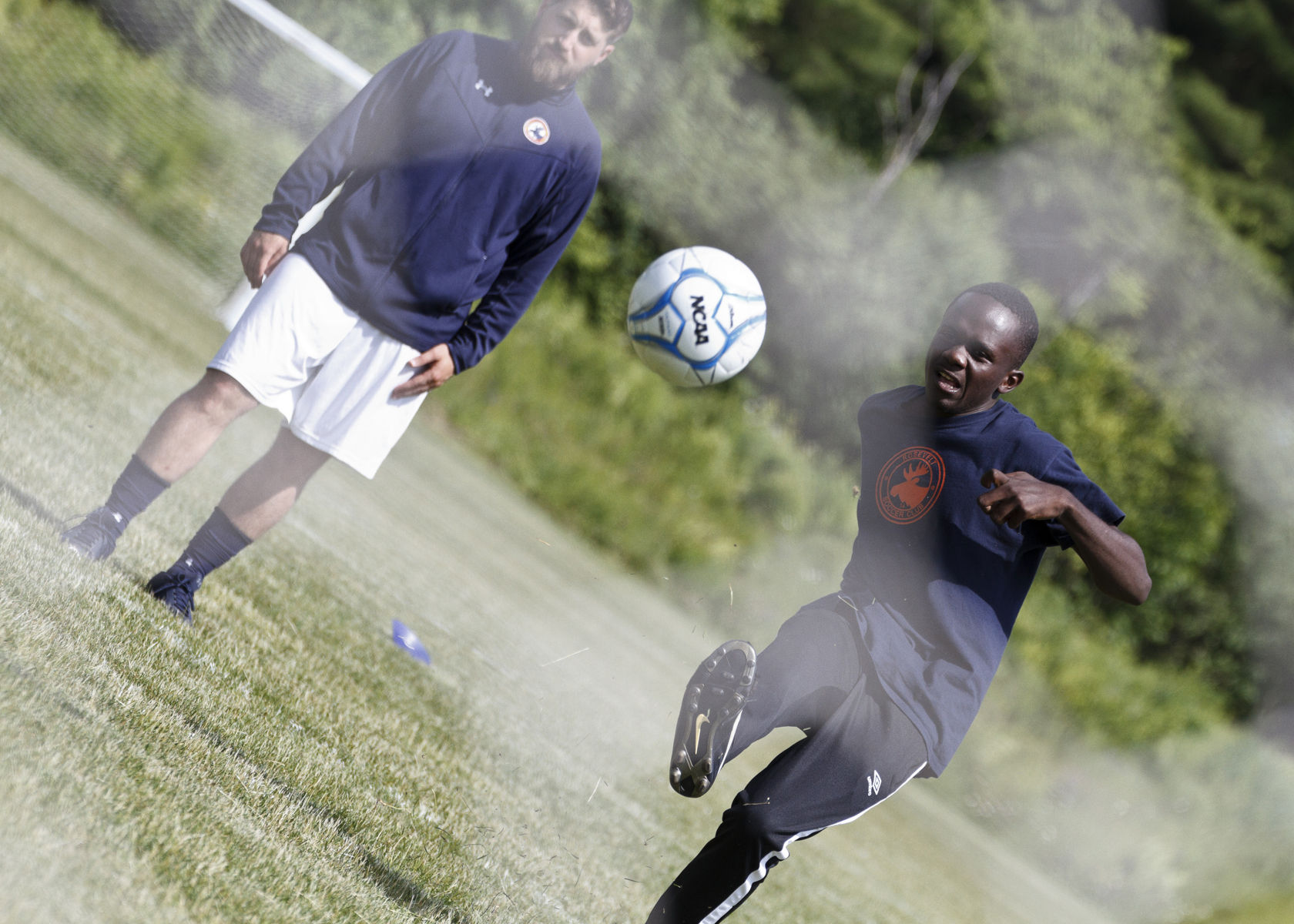 Jonathan Lapika takes a shot at the crossbar at U18 boys practice on Friday.