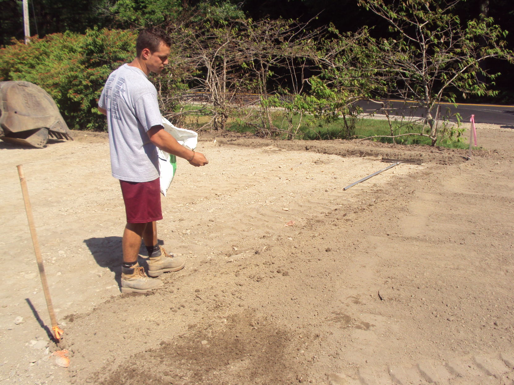 Travis Merrill of J. Maxwell Trucking Inc., of Gray, spreads grass seed on the perimeter of the new parking lot the company is building at the Pownal Road football field in Freeport. Maxwell Trucking is enlarging the parking lot and improving the field’s drainage.Staff photo by Larry Grard