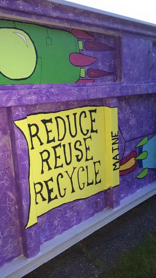 Sebastian Meade of Freeport recently finished painting this ecomaine recycling bin with a space theme. The Portland-based recycling firm collects the contents of the bins, which the company calls “silver bullets,” and recycles them. Meade painted the popular “monsters on green” silver bullets three years ago.Courtesy photo
