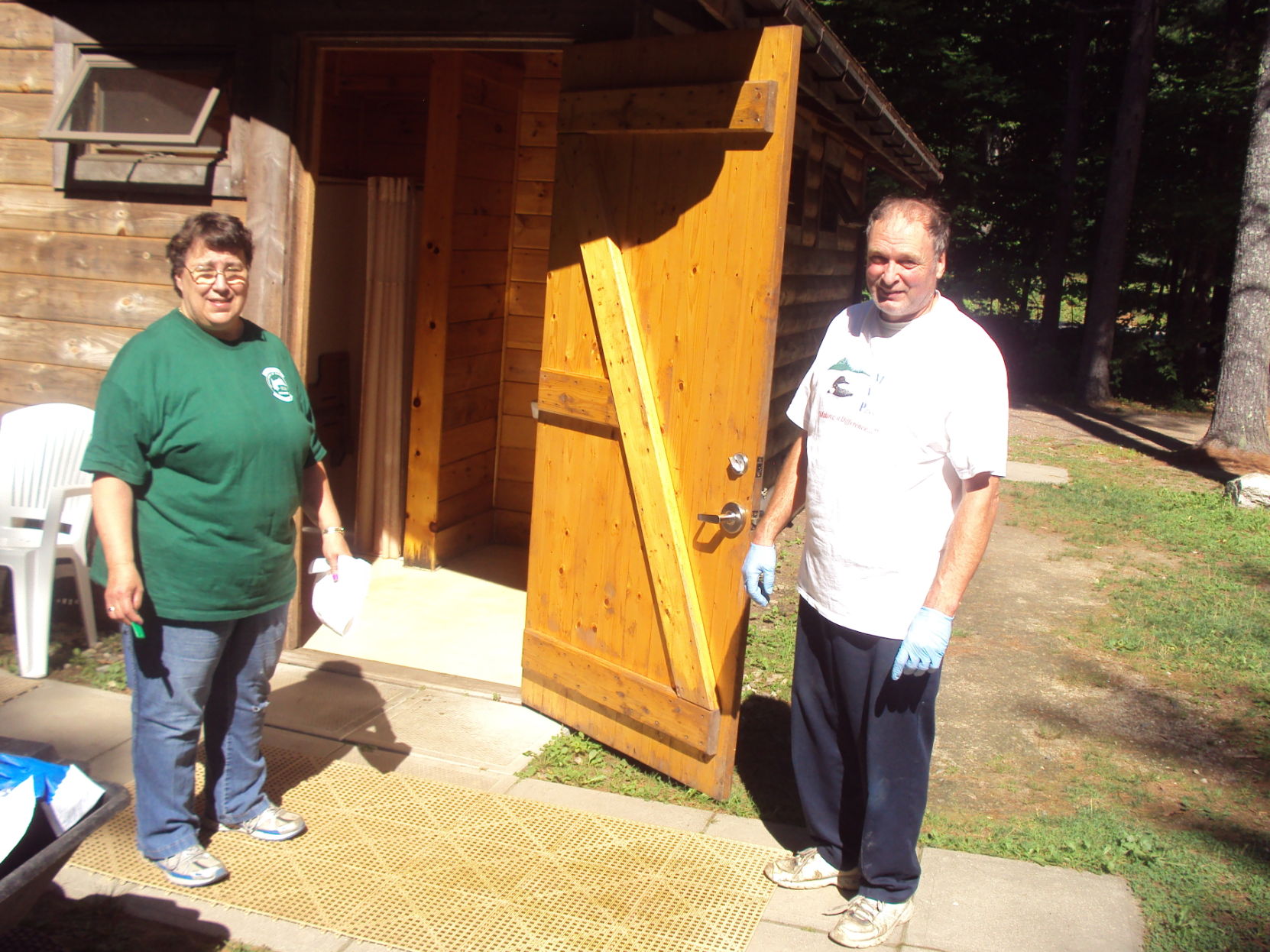 Yvonne and Tony Coulombe of Topsham, park hosts at the Bradbury Mountain State Park campground, pause momentarily in their morning cleaning routine on a recent day.Staff photo by Larry Grard