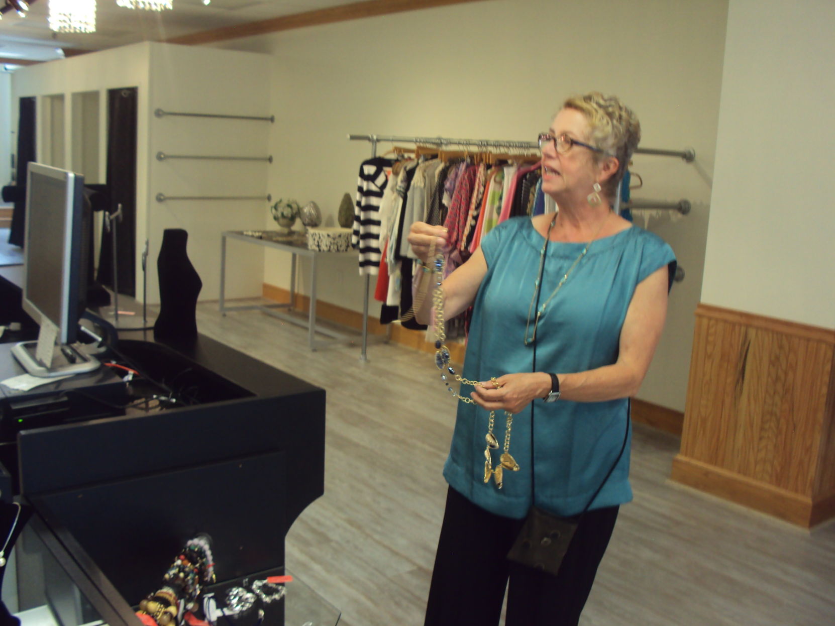 Kathleen Bouquet, who works at Sashay’s on 166 Main St. in Freeport, arranged jewelry on Aug. 3, which was opening day for the high-end women’s fashion boutique.Staff photo by Larry Grard