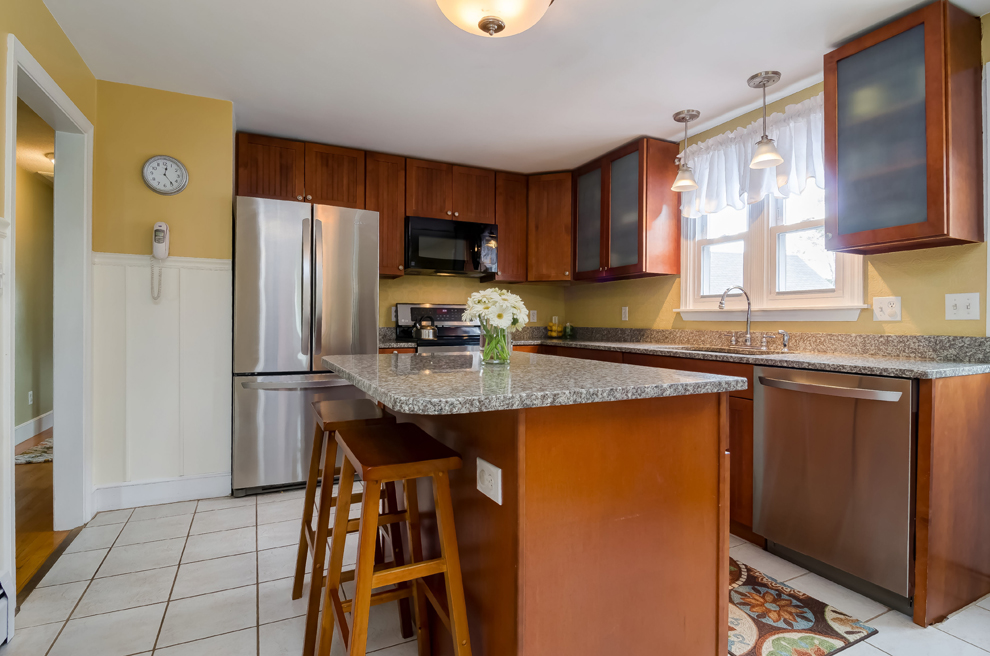 The shingled and wood-sided home is a star, too. Oak floors are in fine shape. The living room has a brick wood-burning fireplace with custom mantel of oak. The new kitchen flows open-plan into a dining area with wainscoting like that in the front entry, and has granite surfaces including island, stainless-and-black appliances, and cherry cabinetry. The kitchen also accesses the large, elevated deck, which overlooks a very nice back yard with a patio and a 12-foot-by-16-foot garden shed.