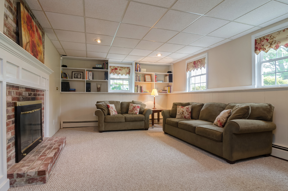 Finished, and partially daylight, living space on the lower level adds 624 square feet of living space, making the home’s total 1,872. Here, behind a French door, is a carpeted family room with a brick wood-burning fireplace and an end wall of built-ins. The adjacent “mudroom” opens to the direct-entry, two-vehicle garage, and has oak cabinetry, a long counter, and a closet, so that additional uses such as crafts room and office come to mind. Next door, the full bath/utility room/laundry is multi-purpose, too, easily accommodating shower enclosure and stacked laundry.