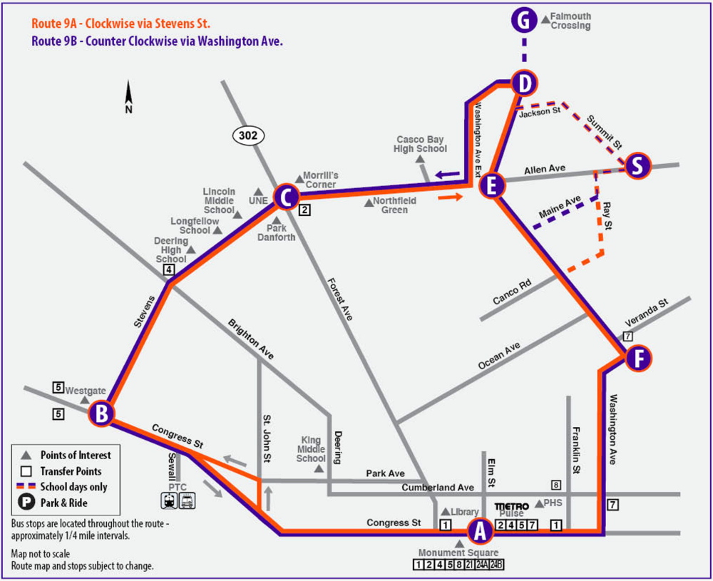 Route 9A travels clockwise from the Portland Public Library via Congress Street to Stevens Avenue, where Deering High School is located. It then hits Allen Avenue, where Casco Bay High School is located, returning downtown via Washington Avenue. Route 9B will run counterclockwise on the same route.
