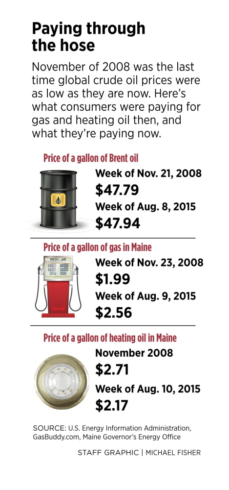 The last time a barrel of Brent oil cost $47, except for a slight dip this past winter, was during the winter of 2008-09. At the time, the average price for a gallon of gas in Maine was below $2 a gallon. So why isn’t gas below $2 a gallon today?
