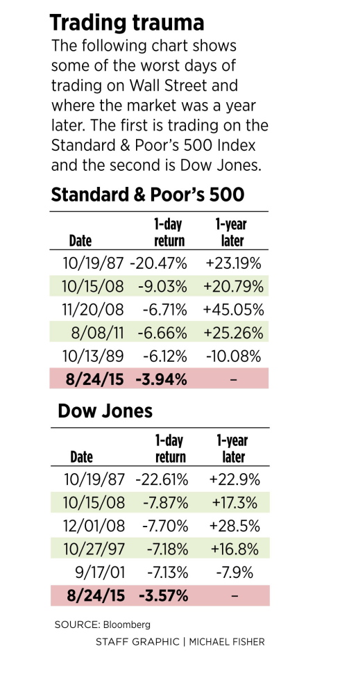 On Wall Street, the Dow Jones industrial average plummeted more than 1,000 points Monday – a historic nose dive – just minutes after the opening bell rang. Stocks then staged a dramatic turnaround, but stumbled again in the afternoon to close down 588.40 points, or 3.6 percent, to 15,871.35.