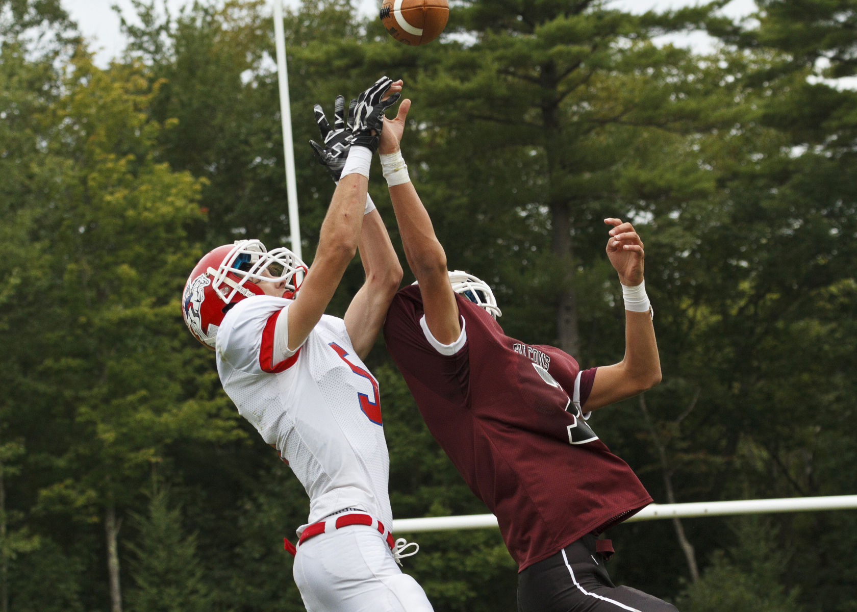 Gray-New Gloucester’s Zack Haskell (left, seen here in action at Freeport last year) is a talented receiver who could put up big points for the developing Patriots this season.