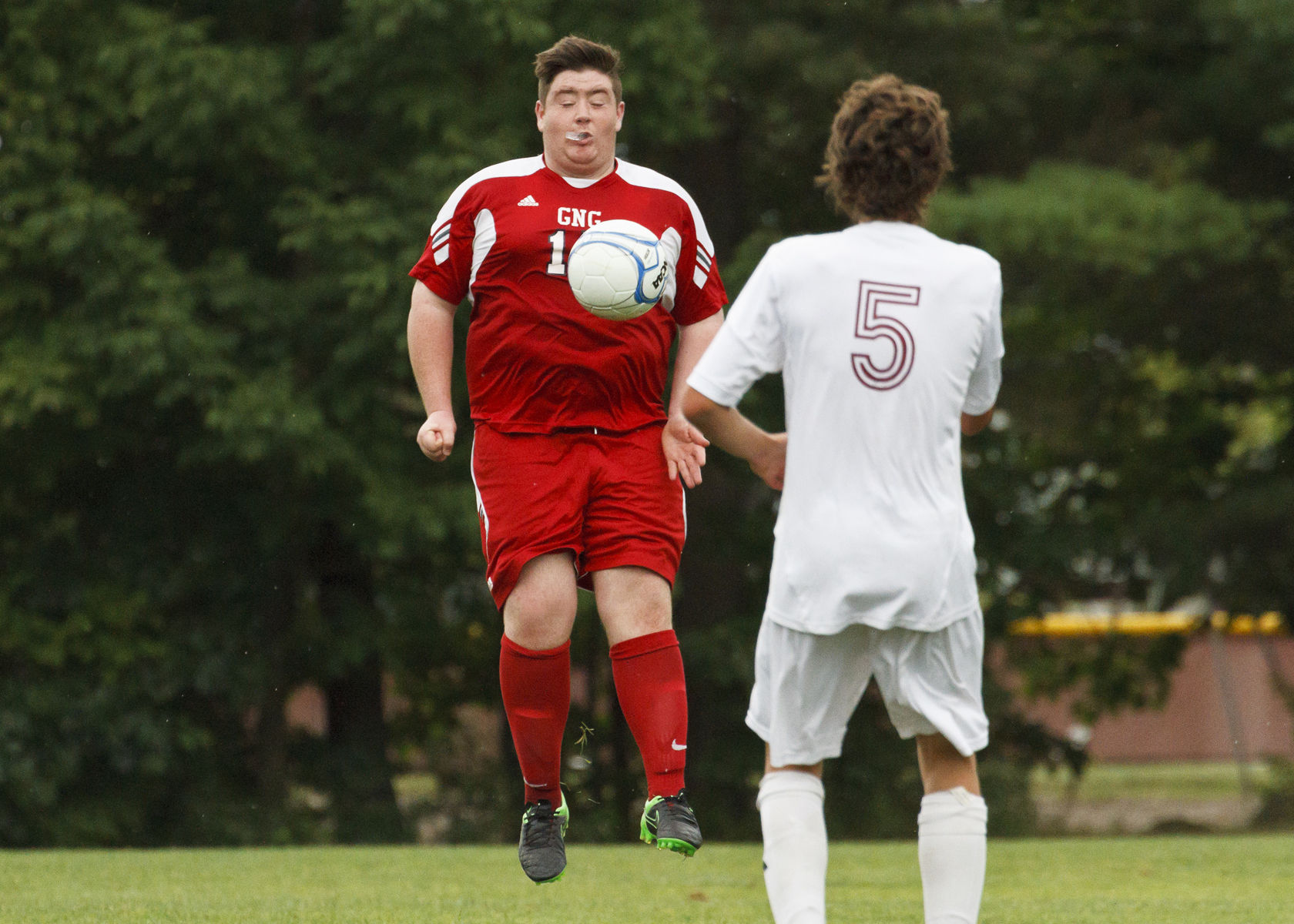 Gray-New Gloucester’s Brady Darnell takes an incoming ball to the chest, looking to settle it, grab control and launch an attack.