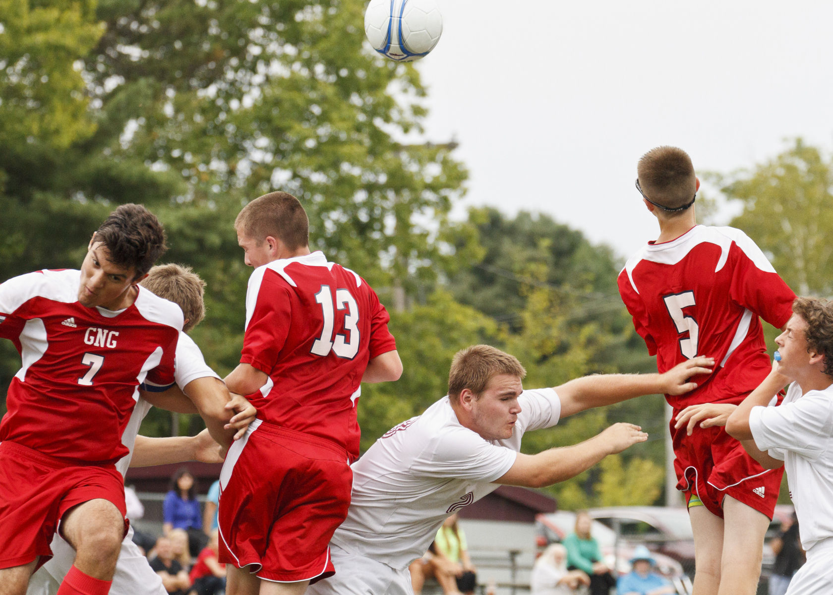 Gray-New Gloucester’s Robert Fernandez (7), Cam Usher (13) and Nathanial Brindley (5) all try for a header, while Freeporter Addison Vosmus (center) tries to clear them away.