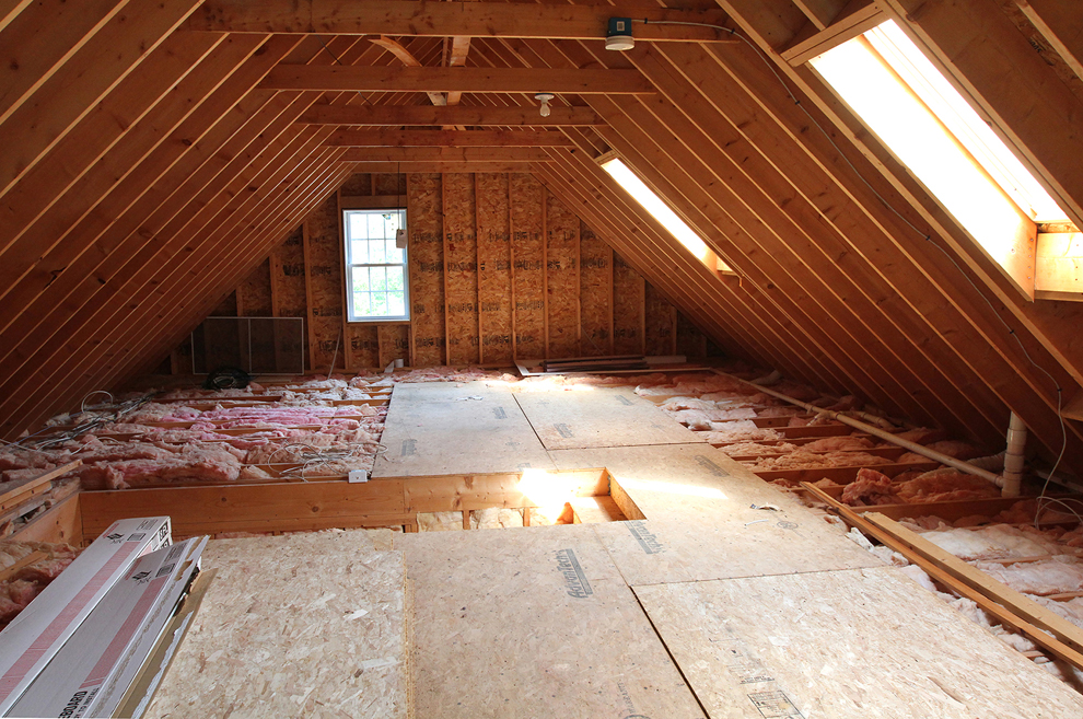Second and third bedrooms are carpeted, as is the master bedroom, and good-sized; they are served by another full bath with soaking tub. The attic – walkup, and daylight thanks to two windows and two skylights – invites finishing too. Like the above-garage space, the attic is roughed out for heat and electricity.