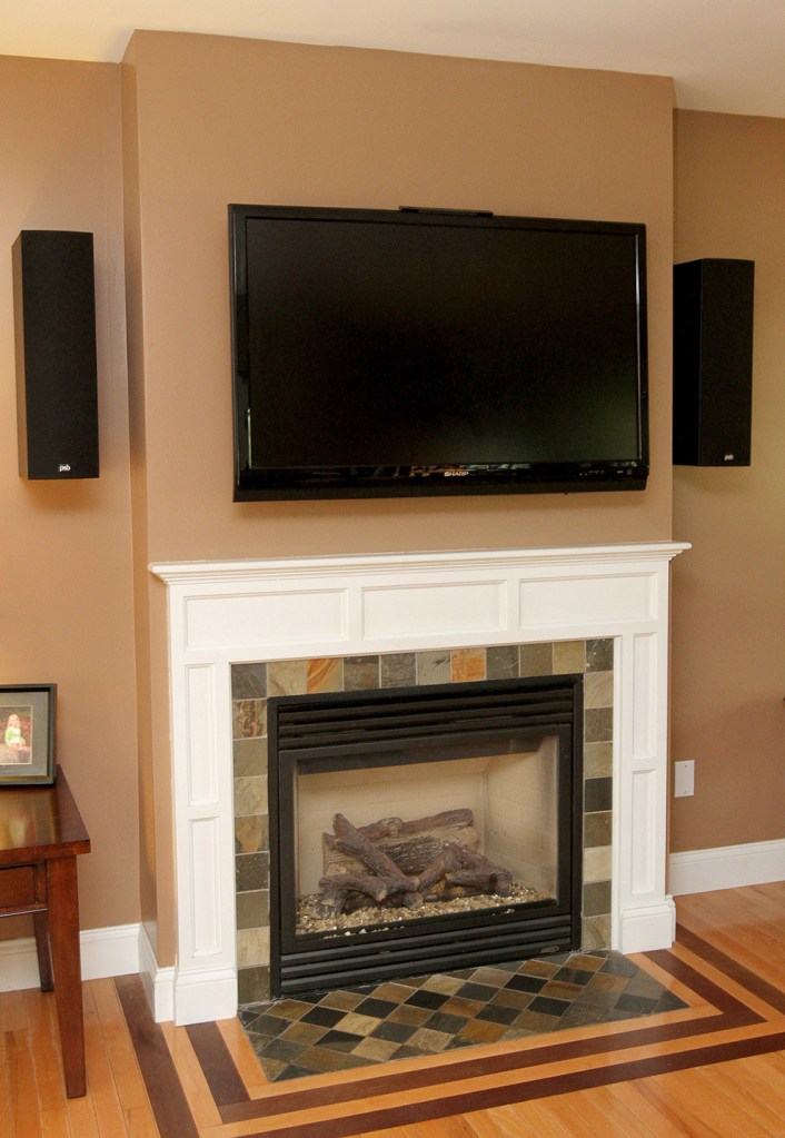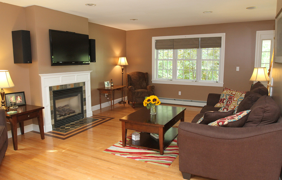Floors are oak. A half-bath is handy in the center hall. The front-to-back living room has a gas fireplace with cool stone-tile surround and hearth, and contrasting dark/light wood flooring inlay. A French door at the back opens to the 12-foot-by-12-foot deck. Interested buyers, please inquire about the hot tub.