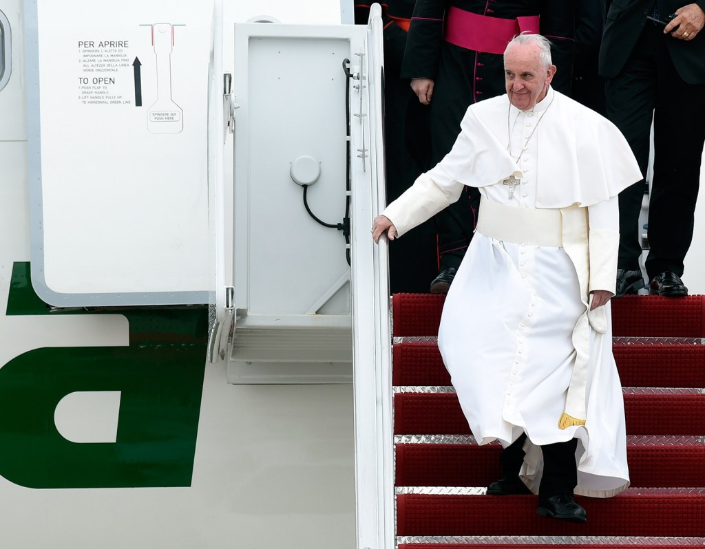 Emerging from the aircraft to loud cheers from a crowd of hundreds, the smiling 78-year-old pontiff removed his skullcap in the windy weather and made his way down the steps in his white robes.