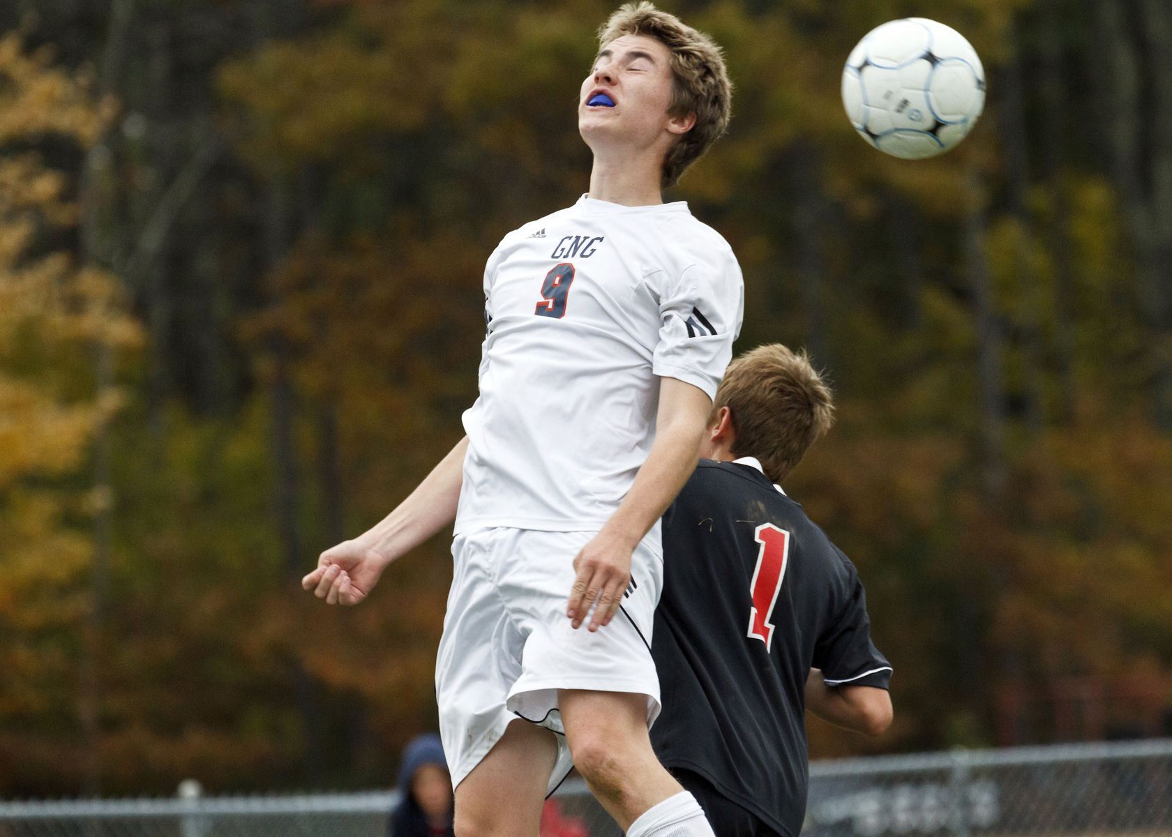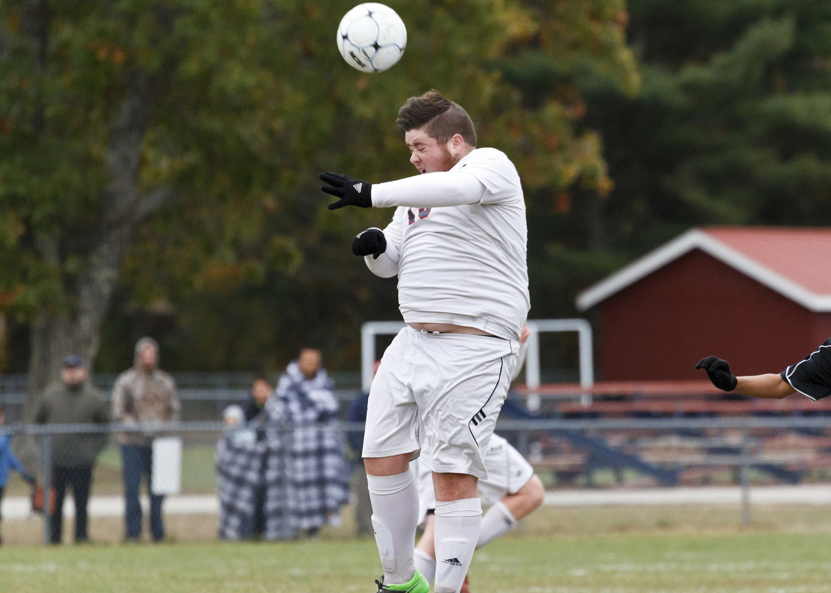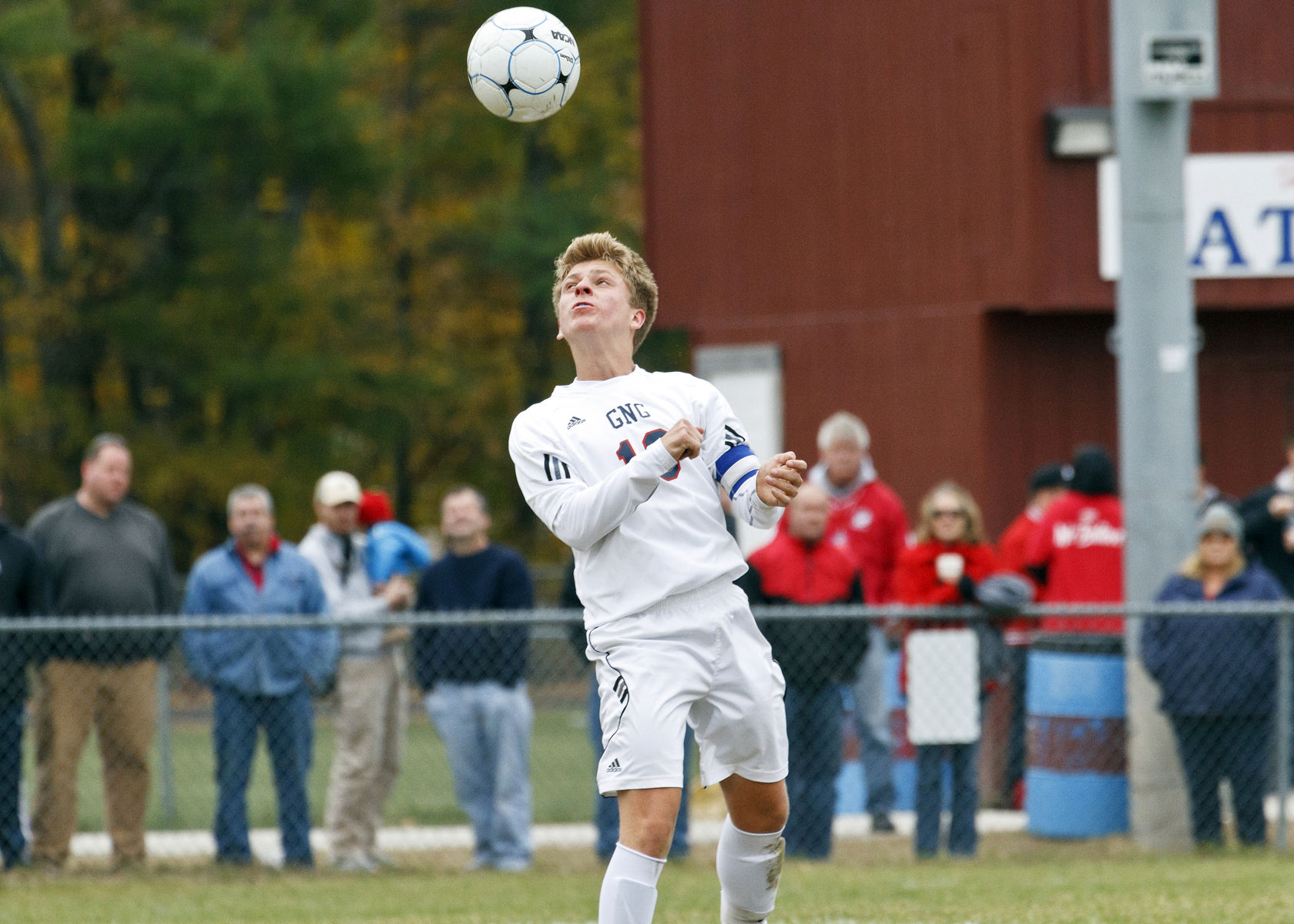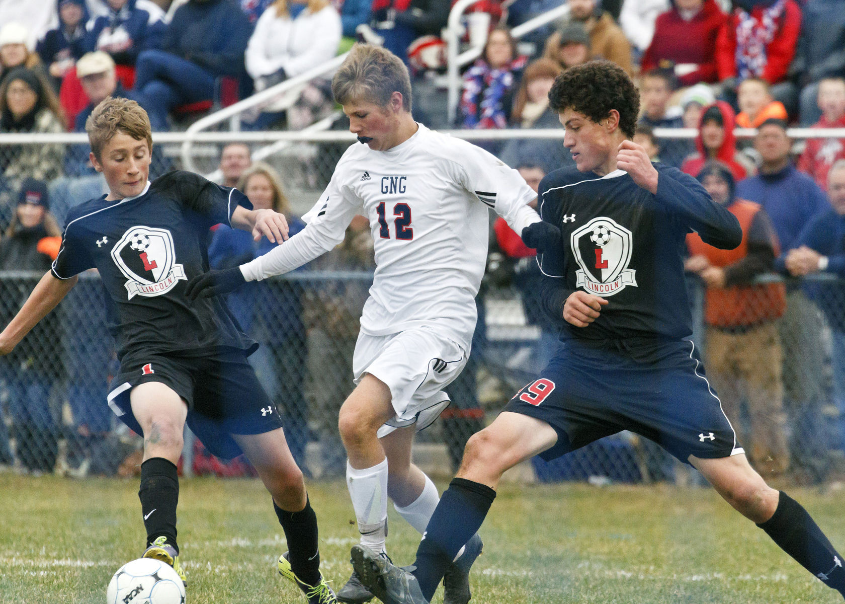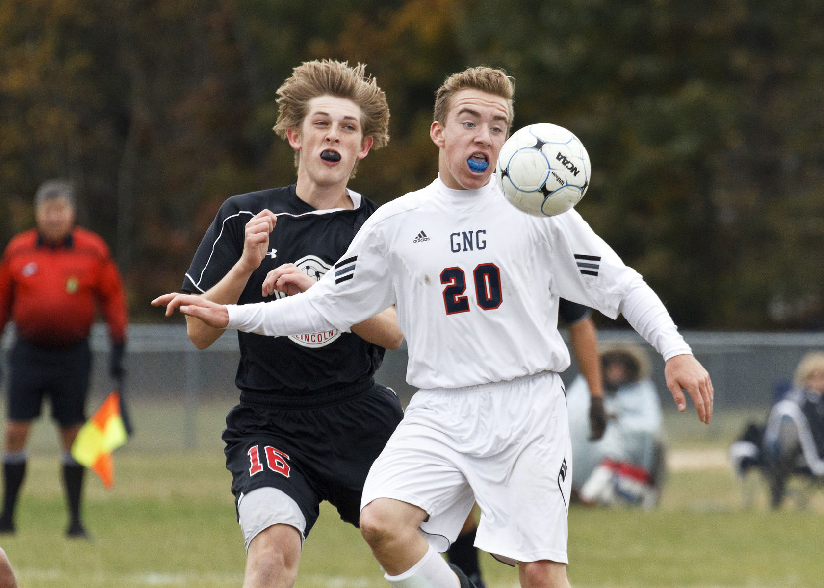 Gray-New Gloucester’s Nathaniel Brindley gave his boys the lead over visiting Lincoln early in the second half on Saturday afternoon – then gave them the win late in the second round of overtime PKs.