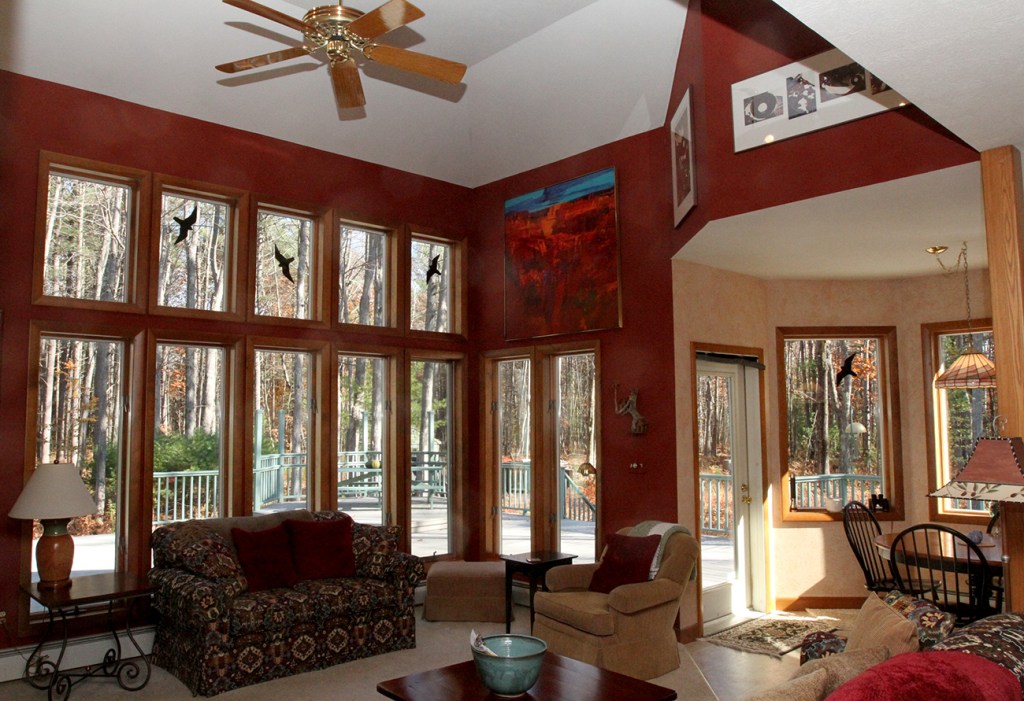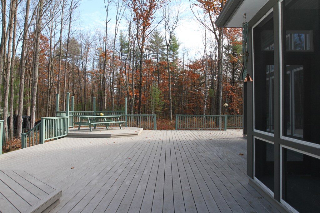The kitchen, which has oak cabinetry, Corian surfaces, and black appliances including wall oven, opens on one side into the butler’s pantry, and on the other into a charming breakfast nook off the living room, which has a floor-to-vaulted-ceiling stone fireplace. Full-view doors open out to an L-shaped deck that is 50 feet wide on its long side, and has raised platforms – octagons – at either end.