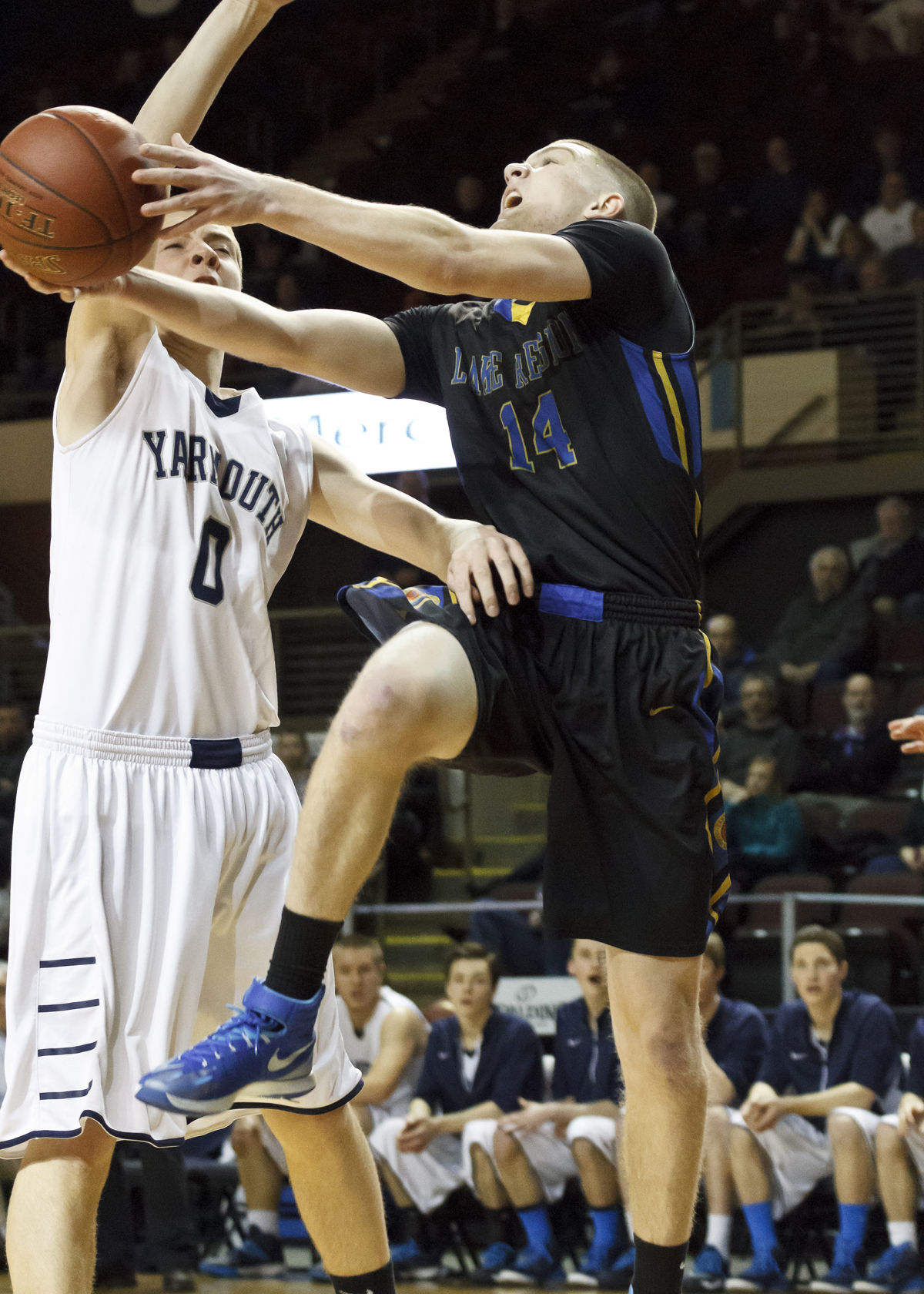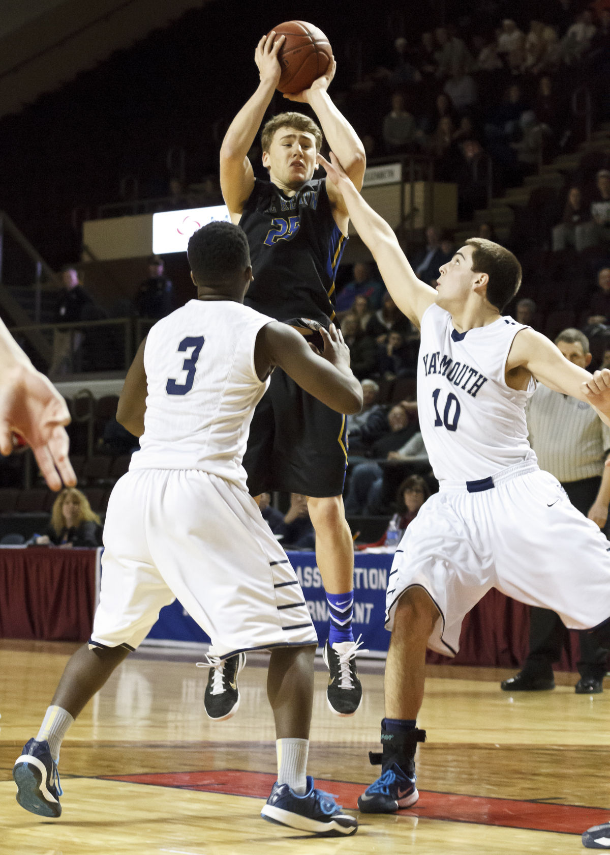 Jack Lesure gets air over a pair of Yarmouth defenders in a huge win for the Lakers last winter.
