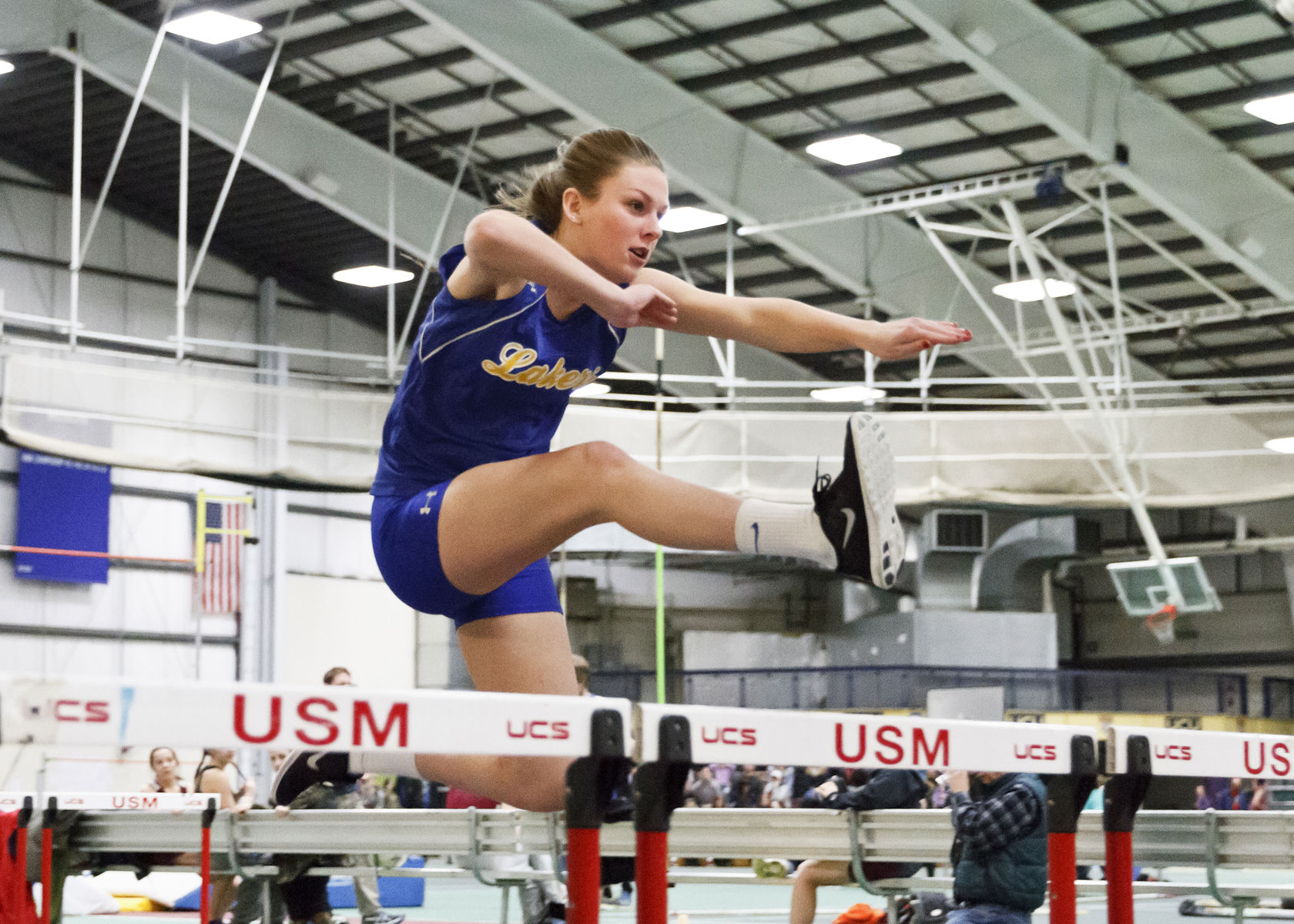 Danica Chadwick hurdles for the Lady Lakers at a meet last winter.