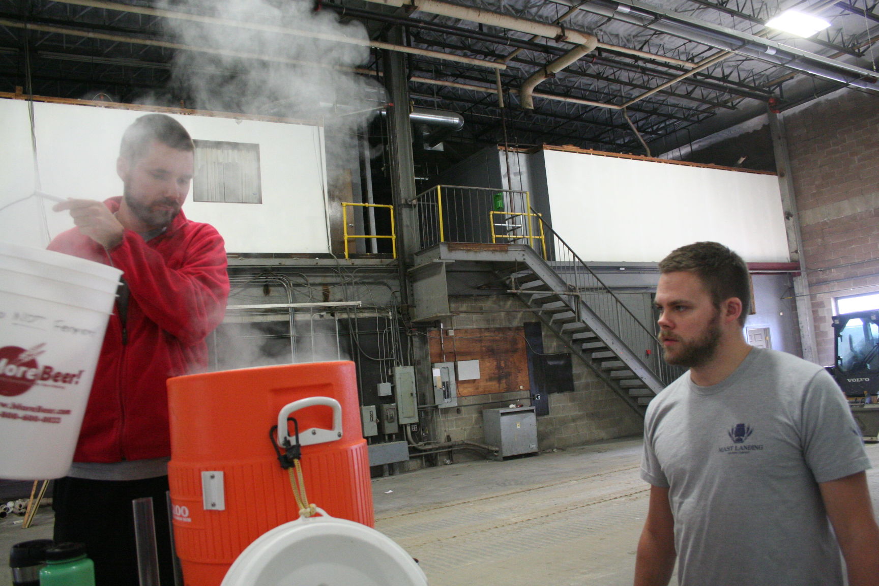Neil Fredrick, left, and Ian Dorsey of Mast Landing Brewing Co. work on their first batch of beer at their unfinished Westbrook location Tuesday. The microbrewery, at 920 Main St., will feature a tasting room open to the public, a first for Westbrook. Staff photo by Andrew Rice