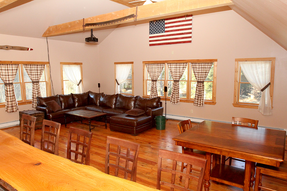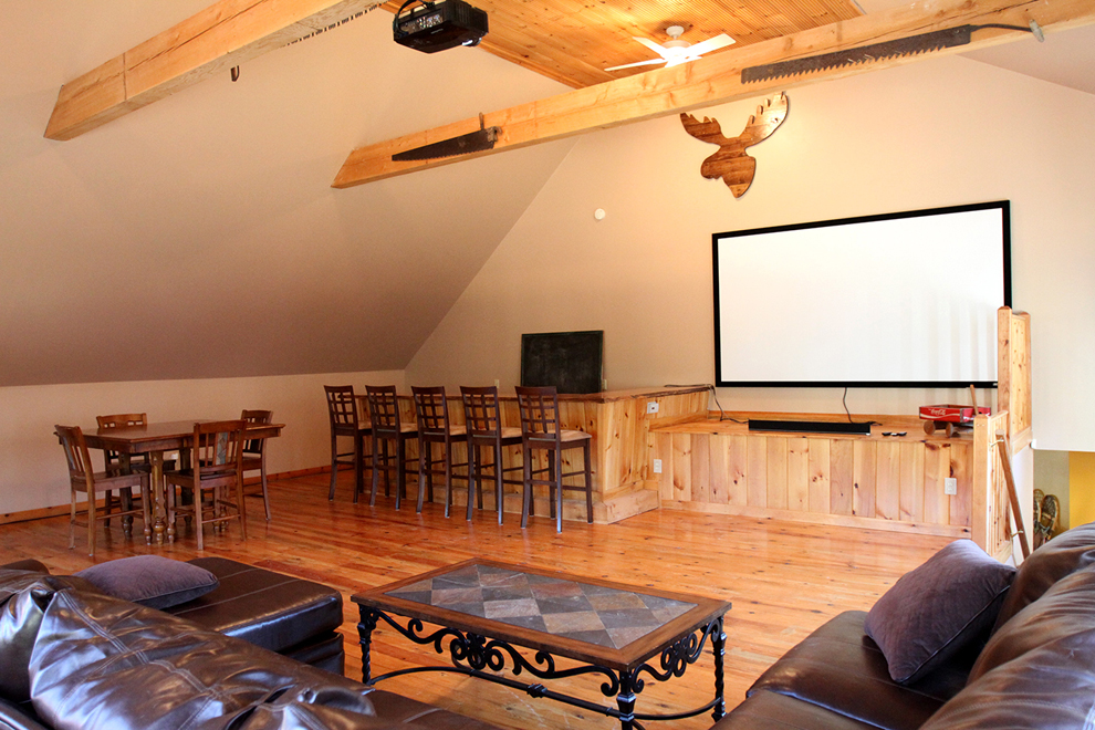 For those who enjoy having guests, or just relaxing with family, there’s an even bigger bonus above the attached garage: A 27-foot-by-29-foot family/media room, with great rustic character, an L-shaped wet bar, extensive seating space, and a 9-foot screen for its projector, all beneath an exposed-beams cathedral ceiling.