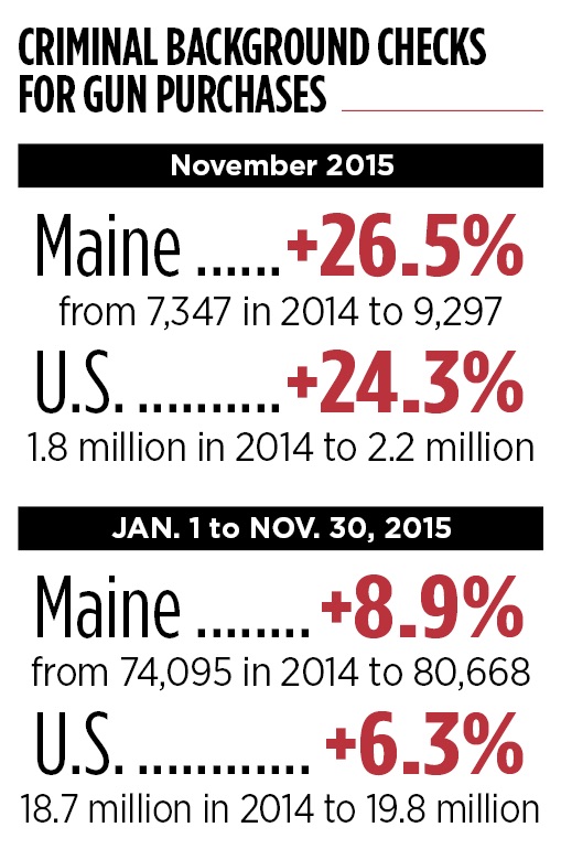 In Maine, the number of background checks in November was up 26.5 percent over the same period a year ago. For the entire year through Nov. 30, the number was up 8.9 percent from the same period in 2014.