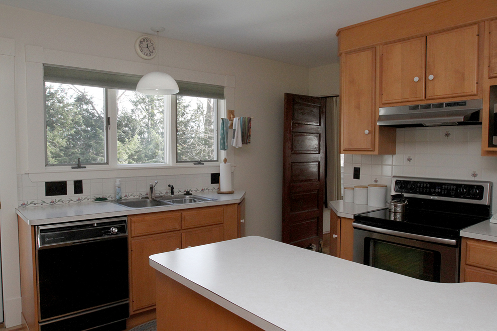 Surfaces, including a dining/work island, are generous; tile, floral backslashes ornament the walls; a full-view door opens to the elevated deck, overlooking the well-screened back yard of the 0.26-acre lot.