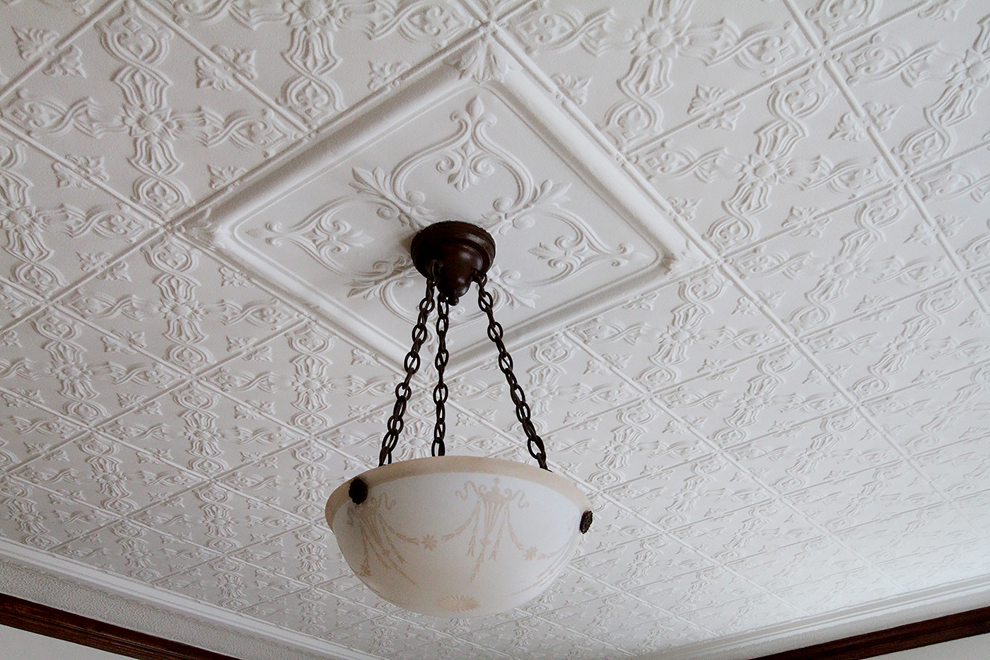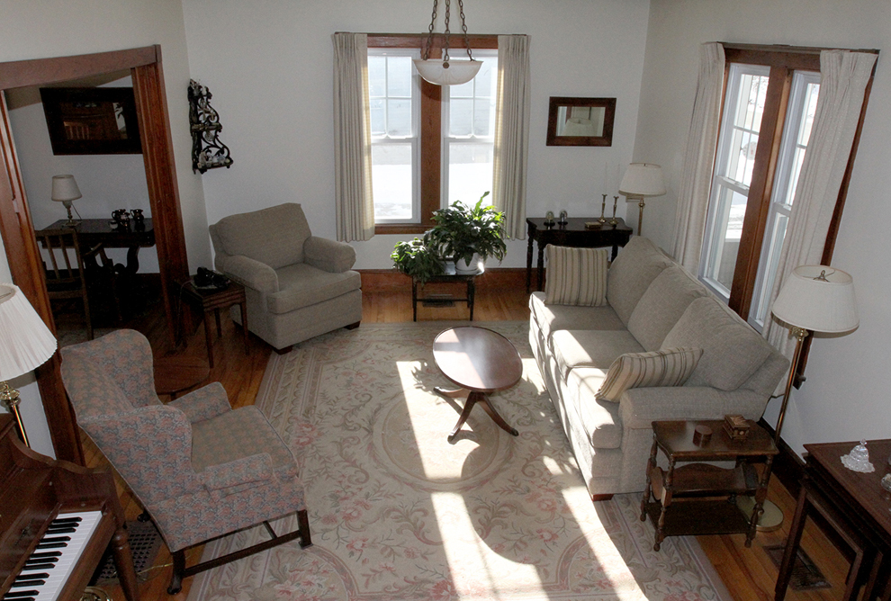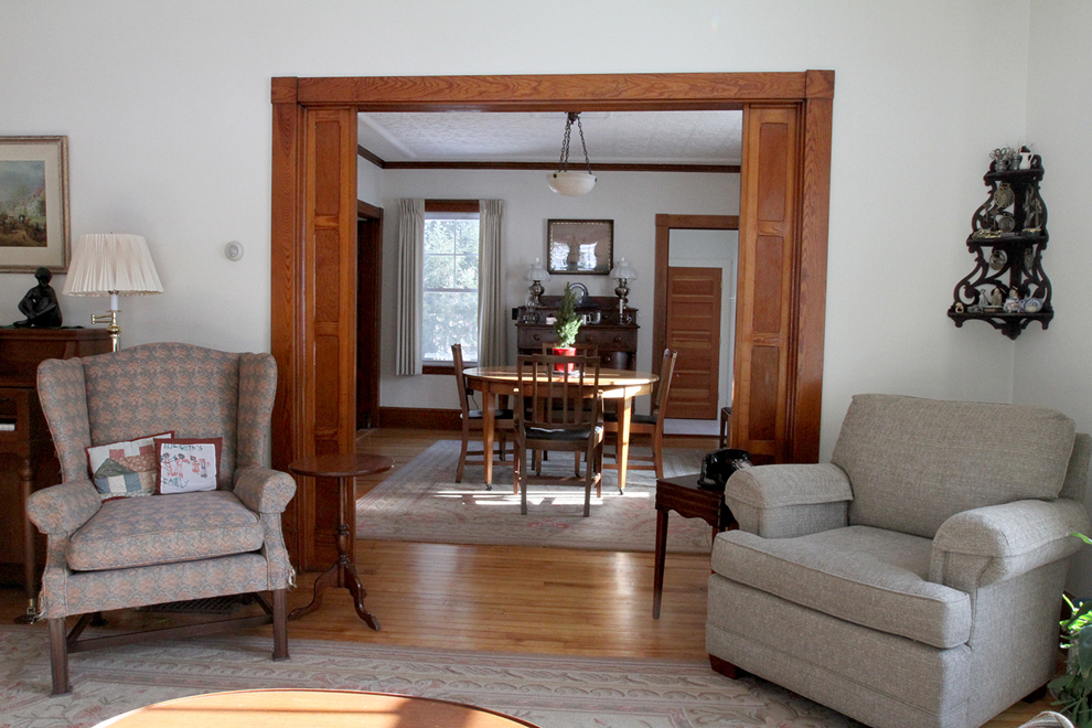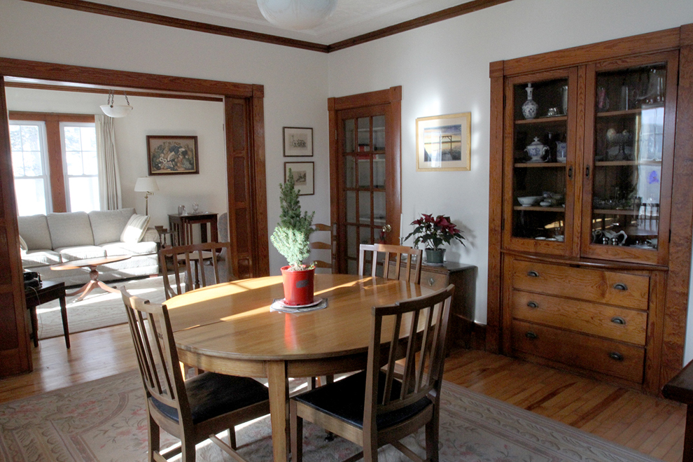 Light-colored interior walls, and tin ceilings in the living room, dining room, and den/office/sitting room, highlight the warm tones of moldings, five-panel doors, maple flooring, beadboard wainscoting, “faux” pocket doors between living and dining rooms, and the extensive, handsome paneling that encloses the staircase, in lieu of balusters.