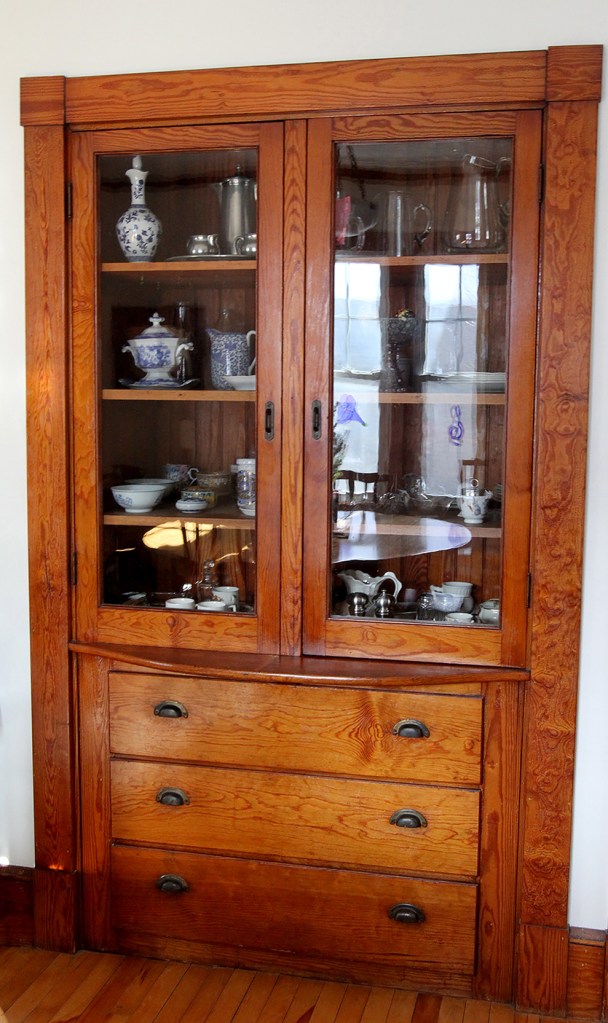 Oak and Douglas fir are everywhere, including the dining room’s elegant built-in china cabinet with curving shelf, but the bright, updated kitchen’s cabinets are maple.