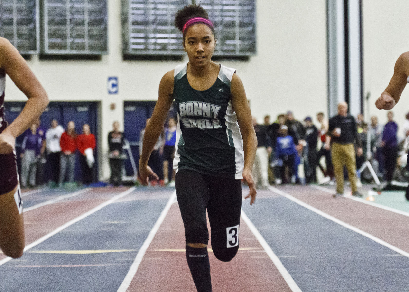 Bonny Eagle’s Sabria Merrifield finished crosses the finish line in the 55 Finals. Merrifield finished fifth in the event.