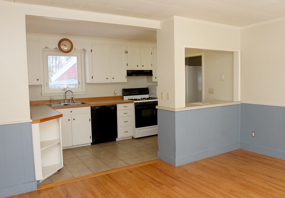 The kitchen is open, across a bar, to the large living and dining room. The bath is off the side hall, at the end of which are two good-sized bedrooms, back and front.