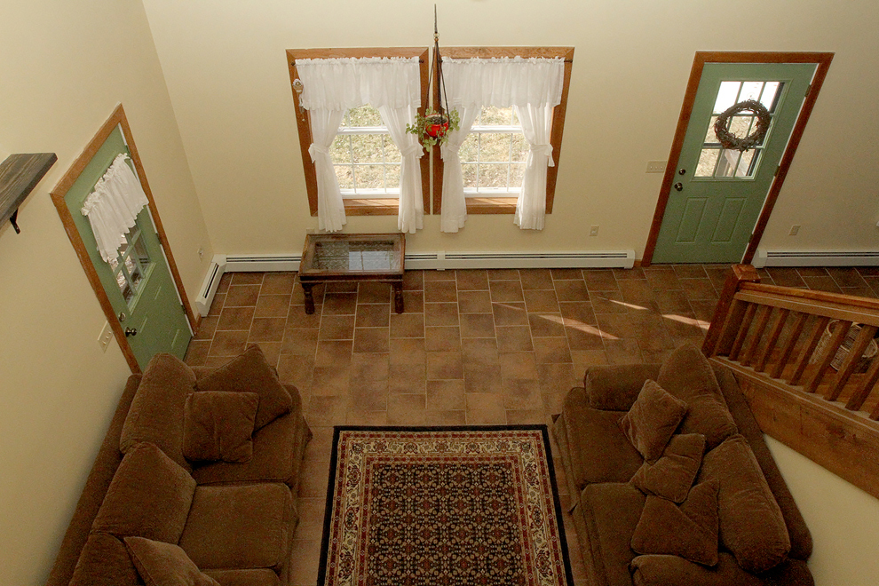 The south-facing house was built by George Stacey, well-known throughout the area for his top-quality work. It’s a Cape, to look at; but its interior is anything but same-old traditional, as you discover when you step in from the farmer’s porch and see a 22-foot cathedral ceiling soaring above you.
