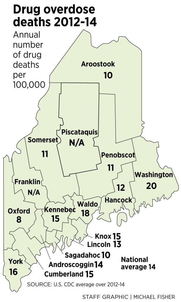 In Maine, residents in Washington and Waldo counties are far more likely to die of drug overdoses than people living in Aroostook and Oxford counties, according to data from the U.S. Centers for Disease Control and Prevention that was highlighted in the County Health Rankings report released Wednesday. The report – compiled by the University of Wisconsin – rates counties across the U.S. on health measurements including cancer, smoking, obesity, alcohol consumption and infant mortality. This is the first year that the County Health Rankings include data on drug overdose deaths.